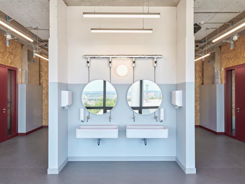 Die Nutzungsänderung erfordert tiefgreifende Sanierungsmassnahmen, um die aktuellen Normen zu erfüllen. Unangetastet bleibt die dunkle Metallfassade. In den Unterrichtszimmern kontrastiert diese mit den hellen Oberflächen der neuen Linoleumböden und holzbeplankten Wände. Geometrische Muster und viel Farbe lockern die langen Korridore auf und helfen der Orientierung. Verspielt präsentiert sich auch das zu Mensa und Mediathek umfunktionierte Hofgebäude. Auf dem rohen Boden der Mensa sind die Spuren der alten Laborwände ablesbar, während sich bei der dazugehörigen WC-Anlage der Blick in die Zukunft richtet: Hier finden sich die ersten Unisex-Toiletten einer Zürcher Schule. Zwischen den Laborbauten verfügt der Schulbetrieb über einen eigenen Aussenraum, der als Pausenhof dient. Er erstreckt sich über die zwei Gebäudeflügel hinaus und weitet sich zu einem informellen Grünraum mit Parkcharakter. Sträucher und Steine sorgen für eine natürliche Abschirmung vom Unicampus.