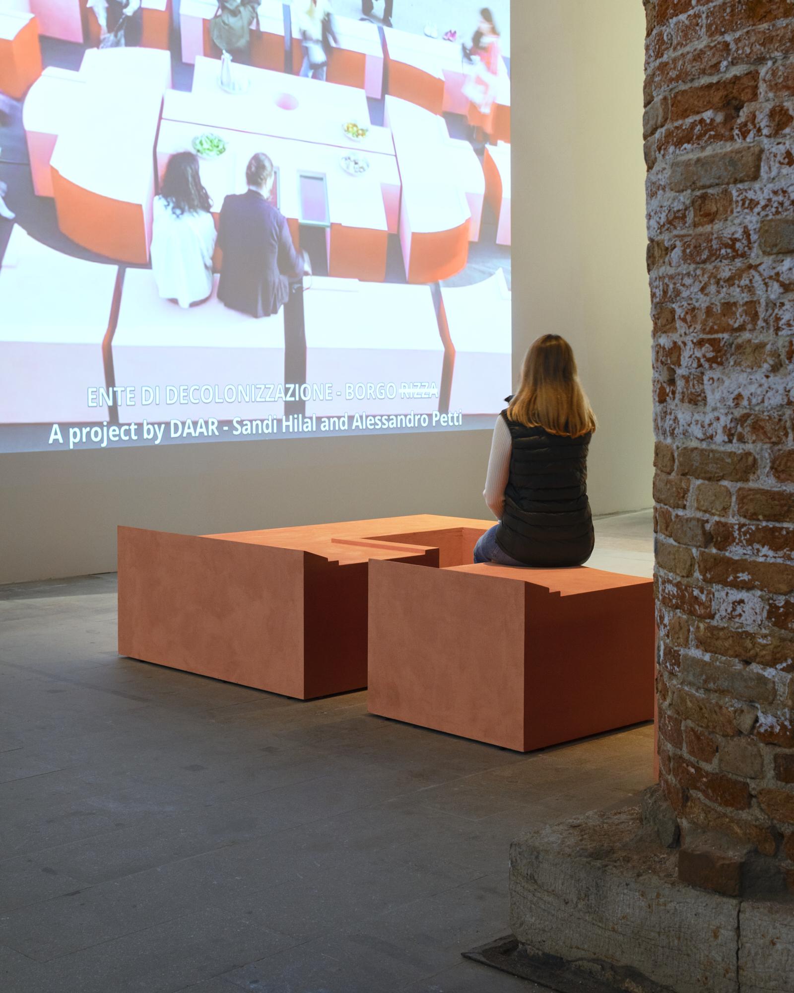 What does it mean to have a Biennale with so many films? Visitors have numerous chances to sit down, take a break from the long walk through the exhibition, and watch what are in the majority short films. (That said, the distribution of the filmic contributions is not even; it is clustered toward the latter half of the long Corderie and in the perpendicular Artigliere.) But these contributions ask a lot from visitors, who can walk by drawings or models at their own pace and own level of engagement, but might be more inclined to engage with the films aping for their attention via sound as well as image. Yet it's not hard to imagine that many of the films could be available online, on YouTube or Vimeo, if not now then in the future, to be watched at will after the Biennale. Therefore the best filmic pieces are integrated with the setting and/or the content, as in the examples shown here. Among them, DAAR's Golden Lion-winning Ente di Decolonizzazione - Borgo Rizza stands out: The film explains the shape of the seating that visitors engage with and expands the exhibit temporally and spatially well outside the confines of the Arsenale.