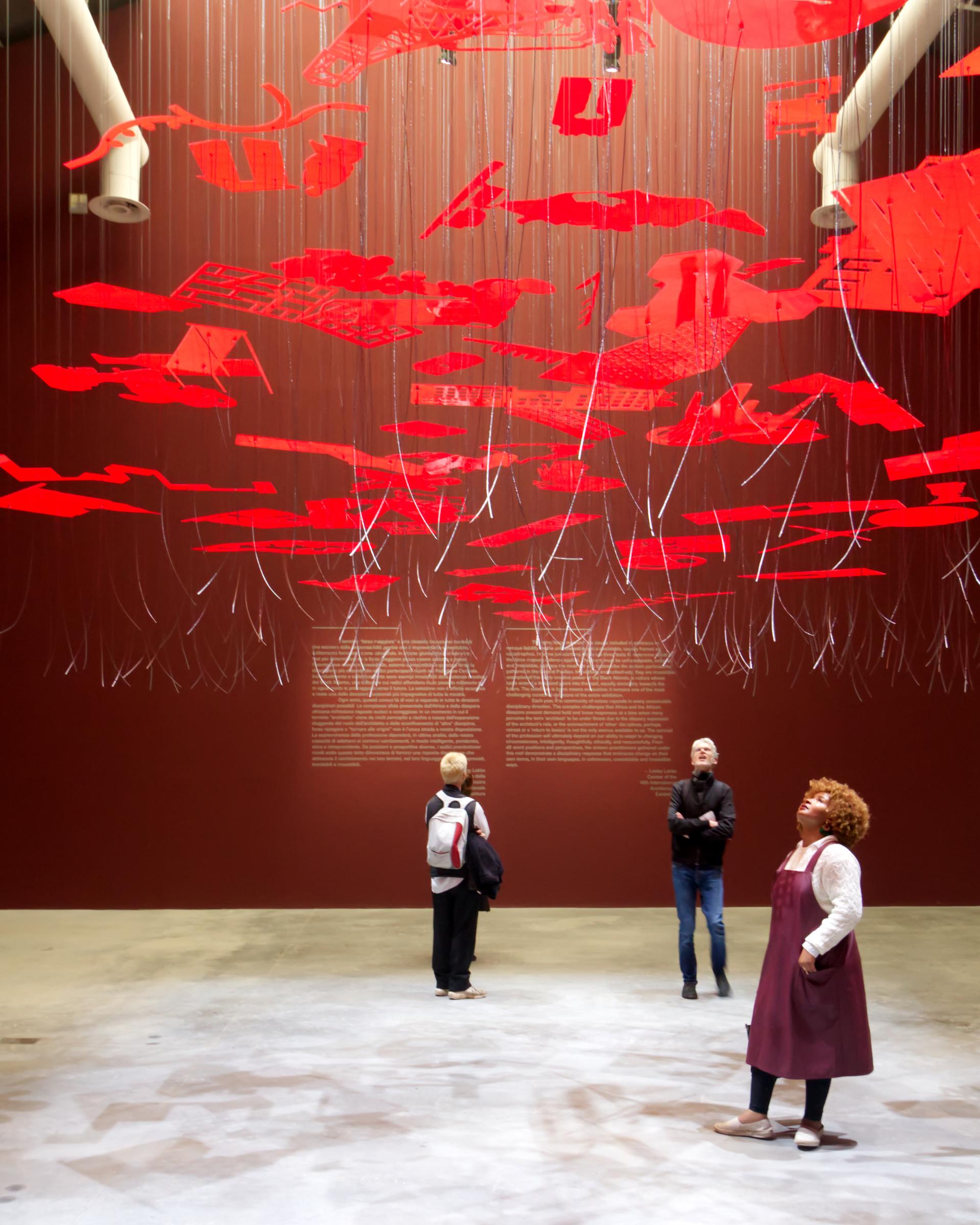 Many of the contributions to The Laboratory of the Future are not as straightforward as ACE/AAP. Visitors must have patience reading wall texts, watching films, and metaphorically scratching beneath the surface to find meaning and relevance in the exhibits. Two large pieces by the Studio of Serge Attukwei Clottey are on display, both taking the name Time and Chance: one hung on a wall in the long Corderie of the Arsenale and a more substantial site-specific piece suspended from the supports of the Gaggiandre (photo above). The yellow, fabric-like installations are made from discarded plastic containers that lend the Ghanian artists's series of works the name “Afrogallonism.” Beautiful from afar, when seen up close the components of the artworks — small squares stitched together in an un-self-conscious manner — clearly exhibit the objects from which they were made, with stickers, corrugations, and even bits of mold part of the expression. Tosin Oshinowo's essay in the exhibition catalog, though not mentioning Clottey, resonates with his work: “As the rest of the world faces similar scarcity challenges [to Africa] due to our urgent climate crisis, the continent's resilience is a case for an alternative approach.”