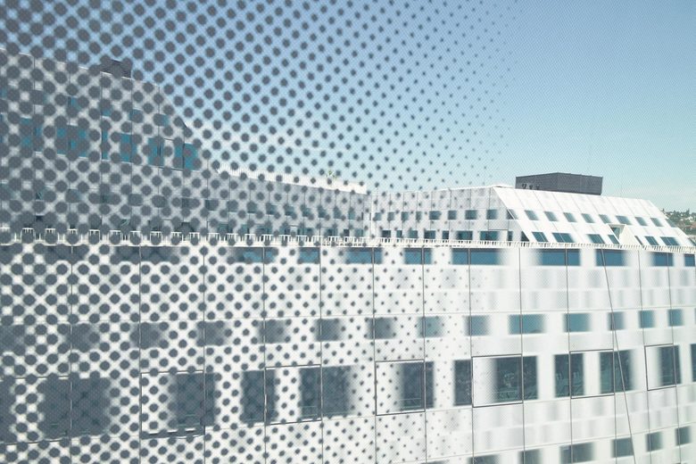 In der Dachfassade erreicht die reflektive Bedruckung den nötigen Sonnenschutz, in den Sockelfassaden ist es der außenliegende, bewegliche Sonnenschutz.