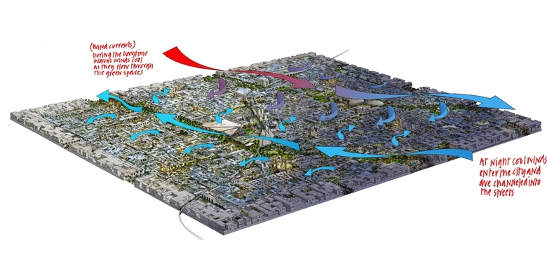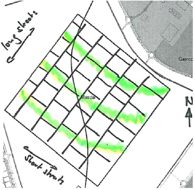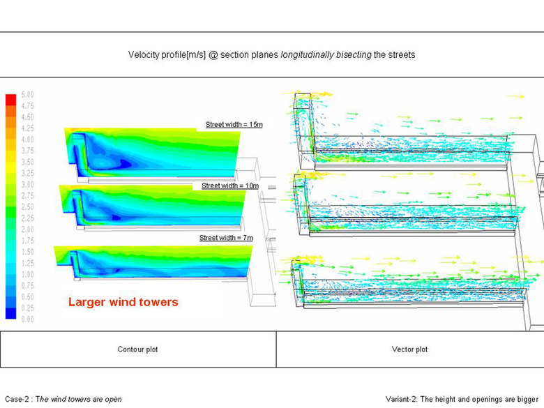 Der Anspruch auf CO2–Neutralität für Masdar City erforderte die Entscheidung, Autos mit Verbrennungsmotoren aus der Stadt zu verbannen. Das reduzierte den Bedarf an Belüftung der Stadt, der u. a. vom so genannten „heat island effect“ abhängt, einem durch Sonneneinstrahlung und städtische Emissionen verursachten Phänomen. Mit Hilfe eines isothermischen Strömungsmodells konnte untersucht werden, wie breit und lang Straßen bevorzugt ausgelegt werden sollten. Um den Einfluss der durch die Photovoltaik-Dächer verursachten hohen solaren Wärmeinträge auf das Mikroklima über der Stadt zu untersuchen, wurde ein vereinfachtes Modell einer ganzen Straße erstellt. Die Ergebnisse erlaubten Rückschlüsse auf die Gestaltung der Straßen und Plätze. Durch detaillierte Modelle konnten Regeln für das Entstehen eines „cold island effect“ abgeleitet werden, das Absenken der Umgebungstemperatur. Außerdem entstand eine Neu-Interpretation des historischen Windturmes der Emirate, der die Straße vor Sonneneinstrahlung und Wind schützt und gleichzeitig als Belüftungselement eingesetzt werden kann. Mit der vorgeschlagenen Ausrichtung und Dimensionierung des Stadtrasters konnten die Anforderungen an Luftqualität gesichert und lokale Klima optimiert werden. Inzwischen sind 50.000 m² des Universitätsgeländes gebaut und Messungen haben ergeben, dass die Konzeption das erwünschte Ergebnis erzeugt.