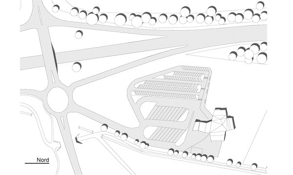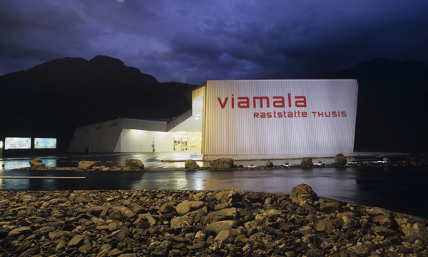 Die Aktiengesellschaft Viamala Raststätte Thusis AG stellte im Jahr 2005 die Aufgabe, an der A13 Ausfahrt Thusis Nord eine Raststätte mit rund 200 Sitzplätzen, 110 m2 Shop, Tankstelle und rund 130 Parkplätzen zu erstellen. Der Entwurf setzte sich mit dem Thema “Raststätte als Fenster zur Region” auseinander. Zentraler Aspekt waren die strukturelle Grundrissgliederung mit zentraler Eingangshalle und die in die Landschaft ausgreifenden Arme. Diese sollten den Kontakt zur Landschaft herstellen, die Jahreszeiten erlebbar machen und spezifische landschaftliche Bilder für den Innenraum rahmen. Von den Parkplätzen auf das Raststättengebäude zugehend, thematisiert das expressiv ausgeformte Tankstellendach den Eingang zur Raststätte. Durch präzise Verdrehungen des Grundrisses konnte zudem ein Nebeneinander von Tankstelle und Eingangszone geschaffen werden. Im Innern des Gebäudes liegt zentral die Bar als Drehpunkt des Gebäudes. Von hier aus erhält der Gast die beste Übersicht über das Angebot der Raststätte. Zwei Arme führen in den Restaurantbereich mit Ausblick ins Domleschg sowie in Schin- und Viamalaschlucht. Ein weiterer Arm führt über den Shop zum Ausgang der Raststätte mit Kassabereich.