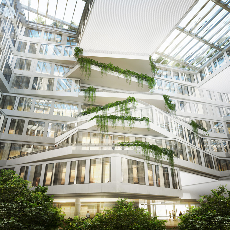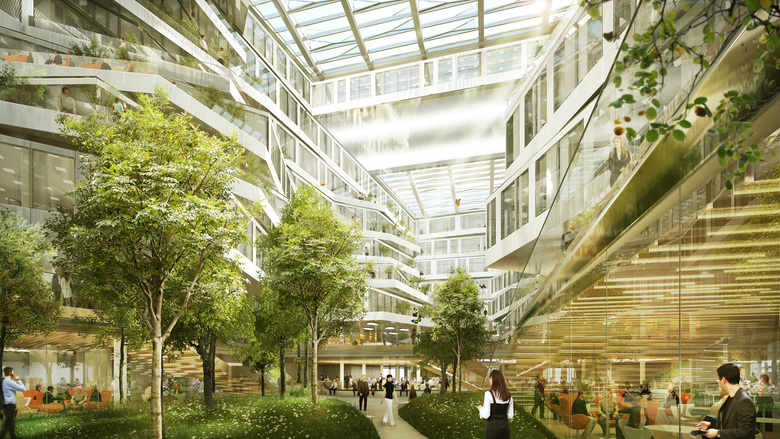 Inside the building, a landscaped atrium bathed in natural light immerses the visitor in an “indoors city” composed of suspended volumes, circulation lanes and working areas extended by plant-covered balconies. The use of materials chosen for their raw appearance (wood, metal, stone, concrete…) integrates natural simplicity into the working space and contributes to the creation of a peaceful and relaxed atmosphere for the 5.000 collaborators and visitors of the company.