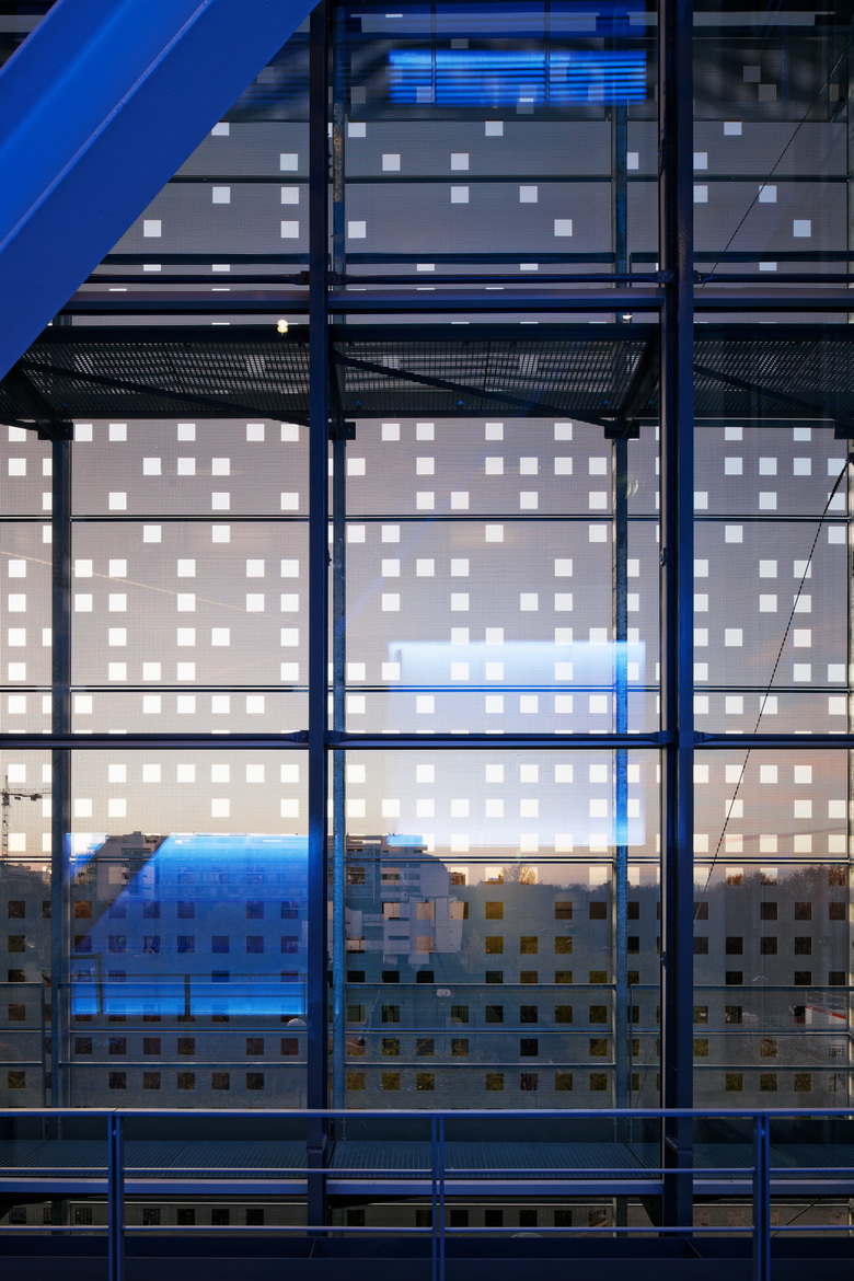 The building rises on a North/South road link, providing the opportunity to use the facade as a mean to communicate with the outside world. The west side of the building, facing the Emile Bollaert park, is clad in a pierced layer of metal resin, giving the impression of a series of pixels.