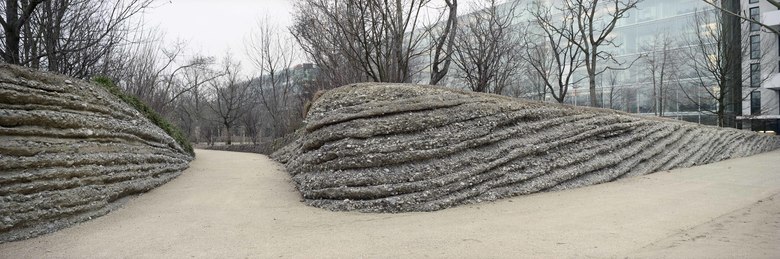 Auf den geologischen Karten von Basel wird eine Landschaft sichtbar, die in der heutigen Realität unter dichten Siedlungs- und Nutzungsstrukturen verborgen liegt: Die von Gletschern und Flüssen geformte Landschaft des Basler Rheintals. Von diesem natürlichen Untergrund ist der Boden des Campus Park durch eine Tiefgarage abgetrennt. Wie eine neue, menschgemachte geologische Kruste liegt sie unter dem Park, der – quasi als riesiger Dachgarten – die verborgene Landschaft des Rheintals in Form einer Komposition aus geomorphologischen und vegetativen Phänomenen des Rheintales nachzeichnet. Das Parkgelände fällt von den höherliegenden Terrassen bis zum Rheinufer hin ab. Wie in der natürlich entstandenen, umliegenden Landschaft der Rheinterrassen werden die Naturerscheinungen dieser Landschaft auf kleinem Massstab in ihrer natürlichen Abfolge nachempfunden und mit gestalterischen Mitteln zu einer atmosphärischen Parklandschaft zusammengefügt, die auch in der Pflanzenwahl auf die potentiell natürlichen Pflanzengesellschaften der Umgebung zurückgreift. In den oberen Parkteilen findet sich ein Wald aus heimischen Gehölzen, in dem riesige Findlinge als älteste glaziale Spuren zurückgeblieben zu sein scheinen. Tiefer im Wald ist das Bild in einem Moment der Zerstörung eingefroren: Wie in einem steilen Bergwald nach der jährlichen Schneeschmelze stehen hier Linden, die Stämme bis 60 cm tief im Geröll vergraben, scheinbar von der Wucht der Steine in Schräglage gebracht. Grosszügige Wiesenflächen formen den mittleren Parkteil, der mit einer abwechslungsreichen Vielfalt von mehrheitlich exotischen Solitärgehölzen bepflanzt ist. Tief eingeschnittene Hohlwege führen durch diese Wiesen in unteren Terrassen in Rheinnähe, ein von lichten Pappel- und Birkengruppen durchbrochenes Schwemmland mit Iris-Riedgraswiesen, wie sie für diese Landschaft typisch sind. So spannt sich zwischen den oberen Parkteilen und dem Rhein ein höchst künstliches Konstrukt auf: Der Park als Bühne der Natur.