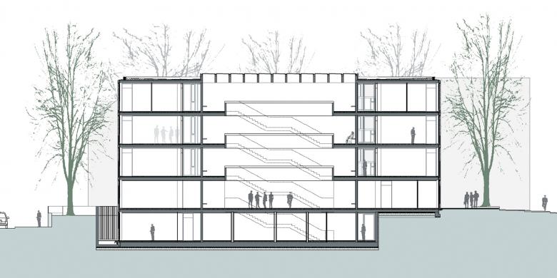 Der 4-geschossige Baukörper des neuen Schulgebäudes öffnet sich schaufensterartig zur Landgraf-Georg-Strasse. Zur angrenzenden Bebauung bildet sich ein campusartiger Platz. Die zentrale, alle Ebenen verbindende Innenhalle bildet das Herz der Schule. Mit ihren Galerien ist die Halle Treffpunkt für Schüler und Dozenten und Versammlungsstätte bei großen Veranstaltungen. Alle der Konzentration dienenden Räume sind ringförmig um die Halle angeordnet. Zwischen den Klassenräumen sind kleinere Gruppenräume angeordnet, so dass differenziertes Lernen in unterschiedlichsten Formen möglich ist. Das Fassadenmaterial nimmt Bezug zu den Altbauten des Elisabethenstifts und der Mathildenhöhe.