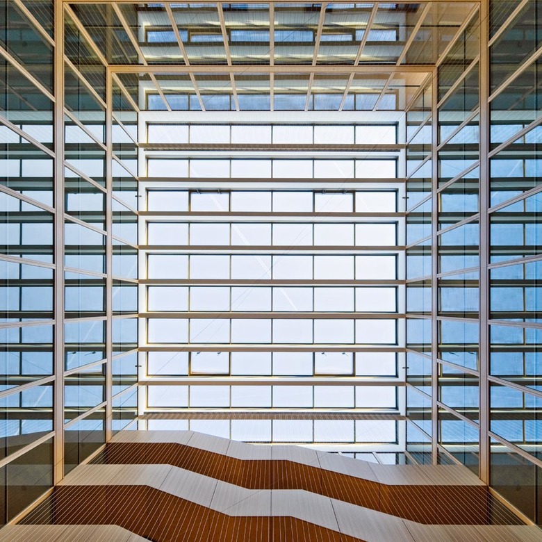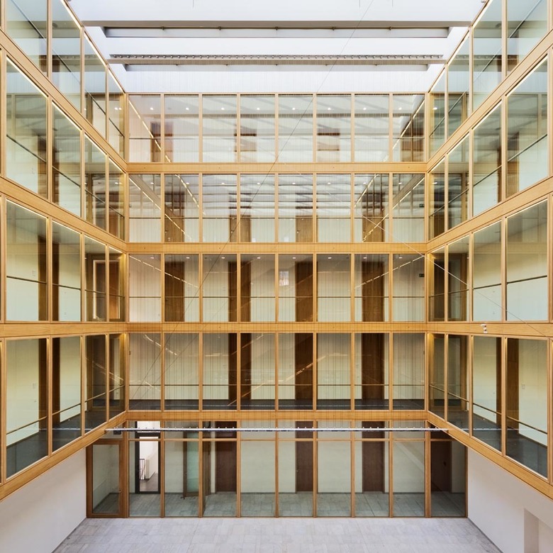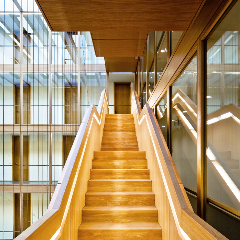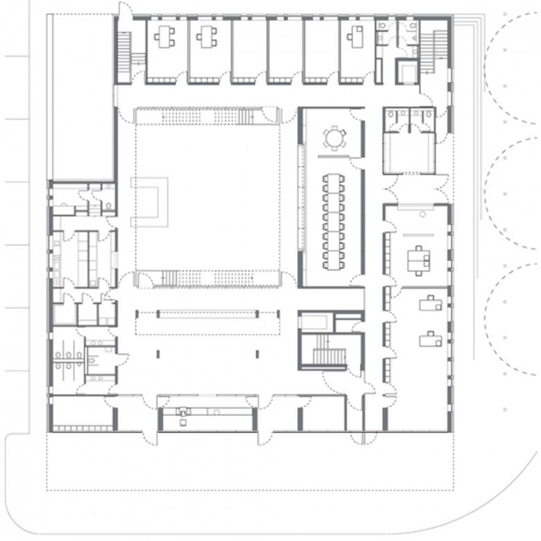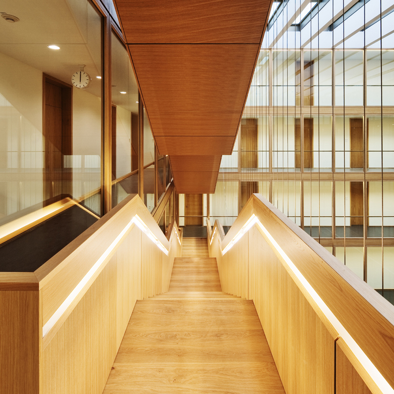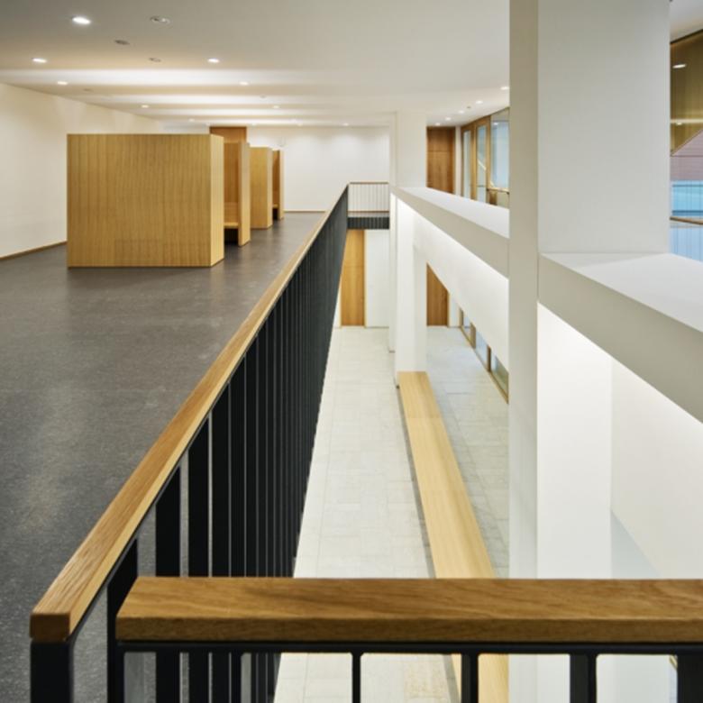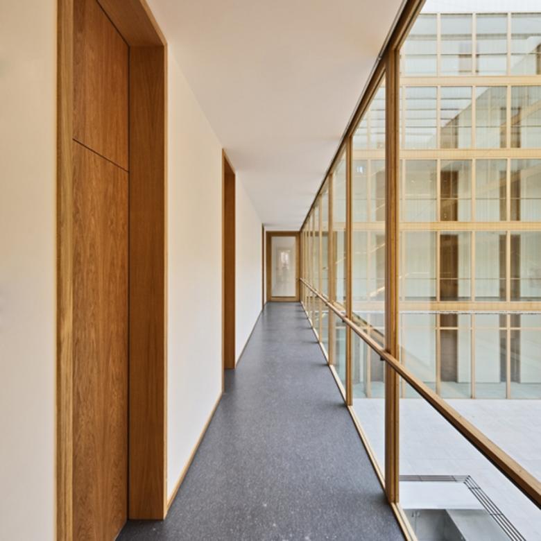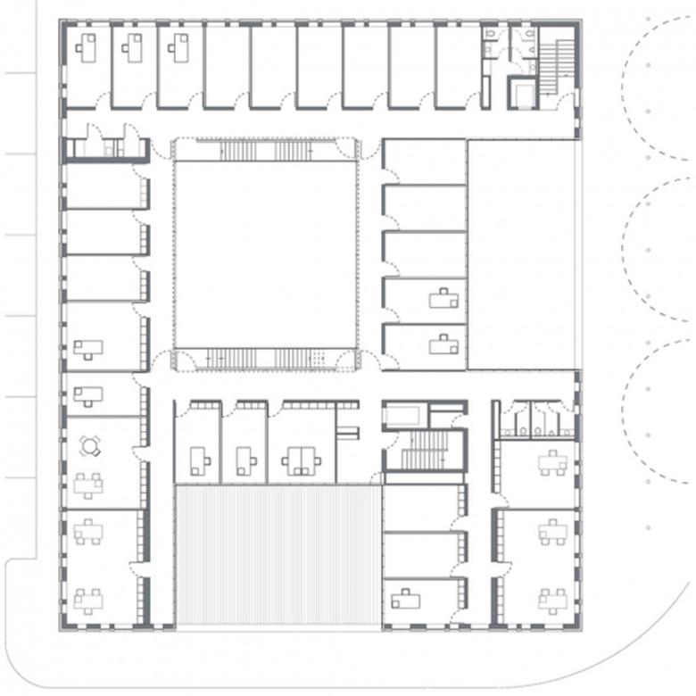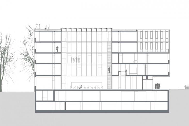 Der 5-geschossige Baukörper wird durch plastische Einschnitte, das Wegnehmen einzelner Volumen aus einem Quader, gegliedert. Es entsteht ein gleichwertiger Stadtkörper in der Reihe von Amts- und Landgericht, der die Maßstäblichkeit des angrenzenden Johannesviertels respektiert. Das 'Herz' und Orientierungspunkt des Gebäudes bildet die lichtdurchflutete zentrale Halle, und interpretiert so das Thema der Erschließungshalle im alten Amtsgericht neu.