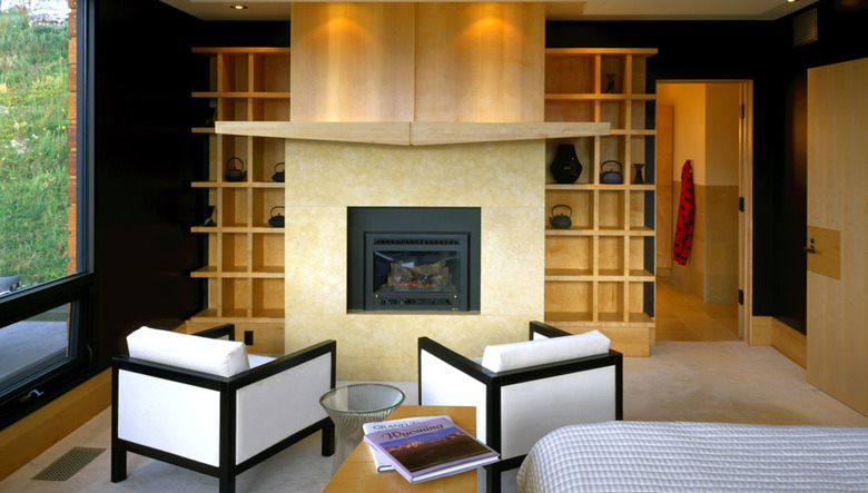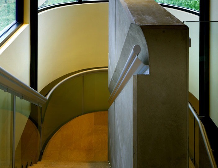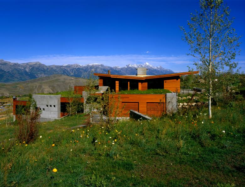 The cascading, grass-covered Warshaw residence unequivocally takes its design cues from its unique sloping Jackson Hole site with unencumbered Teton views. The house emerges from the land, paralleling the slope of the butte with progressively-lower, flat, grassy rooflines. While respecting a 20-foot height restriction, the design skillfully exploits unparalleled vistas and maximizes views through the stepped composition. Connection with the natural surroundings is heightened by the addition of a reflecting pool as well as a glass-and-steel water trough that courses along the structure’s exterior. And while the site inspired the residence’s composition and massing, the exposed concrete, cedar and steel materials speak to its “built” nature—original and honest rather than imitative of the natural world. A butterfly roof capping the topmost level—and echoed in smaller umbrella-like awnings that extend over the patio—provides visual interest to the “cascading box” design while referencing the uplift of nearby mountain ranges.