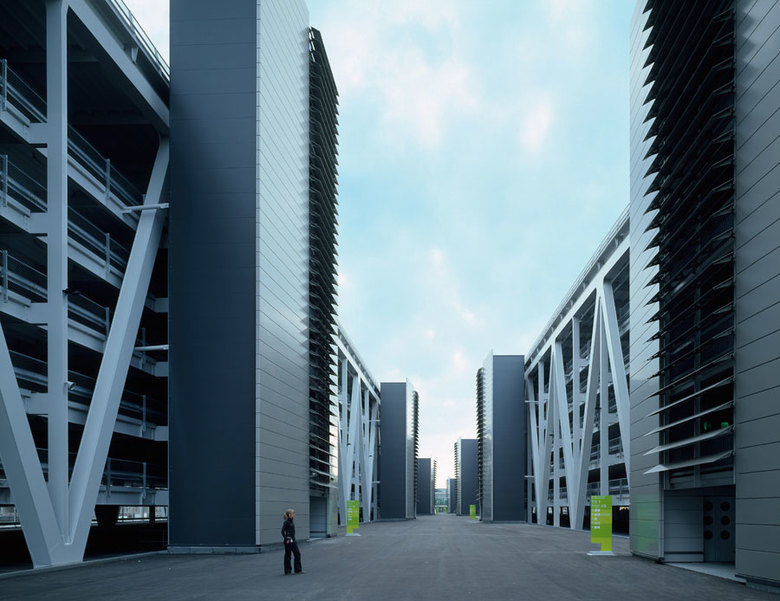 Minimaler Landschaftsverbrauch, kurze Wege sowie das unverwechselbare Erscheinungsbild der Messehallen mit ihren geschwungenen Dächern zeichnen das Messegelände aus. Der keilförmige Zuschnitt des Messeparks erleichtert die Orientierung. Die Niveausprünge eröffnen optimale Erschließungswege für die Beschickung. Von den Messehallen heben sich das Kongresszentrum und die Multifunktionshalle ab, deren Silhouette einem Zirkuszelt ähnelt. Als „Superzeichen“ schwingt sich das begrünte Parkhaus über die Autobahn und die geplante ICE-Trasse. Die Neue Messe am Stuttgarter Flughafen nimmt die Topografie der Umgebung auf und geht sensibel mit den ökologischen Ressourcen um. In den Dächern ist eine 40.000 Quadratmeter große Solaranlage integriert. Die klare, rationale Formensprache wird überlagert von einer freien, bewegten Linienführung, die Gesamtanlage wirkt leicht und großzügig.