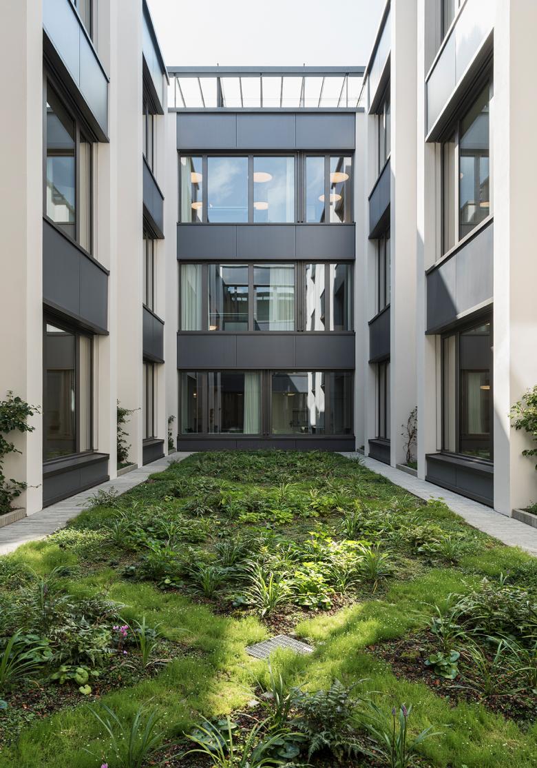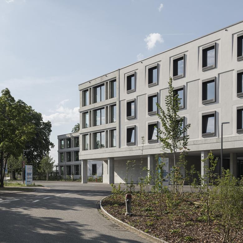 Der Neubau ist als dreiflüglige Anlage konzipiert. Die Flügel sind jeweils um einen Innenhof organisiert, welcher die innenliegende Erschliessung belichtet. Der zentrale Flügel mit dem grössten Innenhof nimmt im Erdgeschoss die öffentlichen Nutzungen auf. In den oberen Geschossen sind über drei Stockwerke Stationen angeordnet. Die Grundflächen des Erdgeschosses und der drei Obergeschosse sind kongruent. Zwei Drittel dieser Geschossfläche ist unterkellert. Das Dachgeschoss ist zurückversetzt wodurch im zweiten Obergeschoss eine zum Teil begehbare Dachterrasse entsteht.