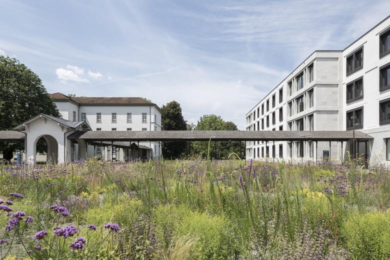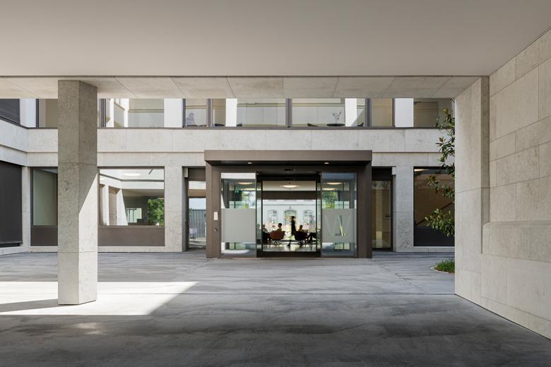 Das alte Hauptgebäude der Klinik schreibt sich als grossmassstäbliche Anlage mit einer Art Cour d’honneur in den Kontext des Königsfelder-Parks ein. Der Neubau bildet ein Gegenüber des Hauptgebäudes, fasst den Hofraum zur Nordseite und macht ihn zu einem öffentlichen Teil der Parkanlage. Die zentrale Achse des Hauptgebäudes wird mit dem Neubau gestärkt und das Ensemble wird an die neue Hauptachse des Klinikareals angebunden.