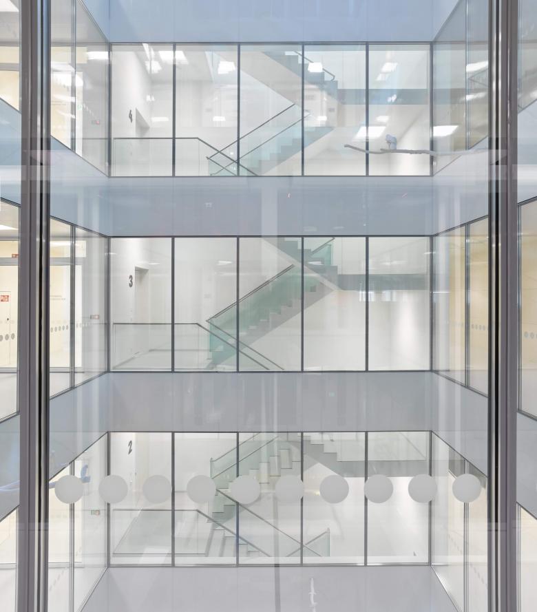 Das Gebäude zeigt sich monolithisch, da Fenster- und weisse Betonbänder ohne Versatz ausgebildet sind. Das extensiv begrünte Dach bildet die fünfte Fassade. Das offene Atrium bildet die vertikale Verbindung aller Geschosse und sorgt für zusätzlichen Tageslichteinfall.