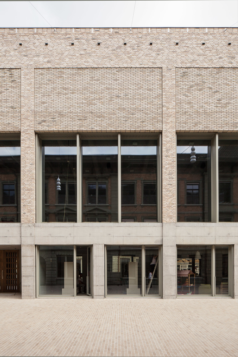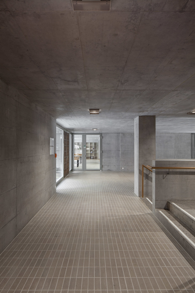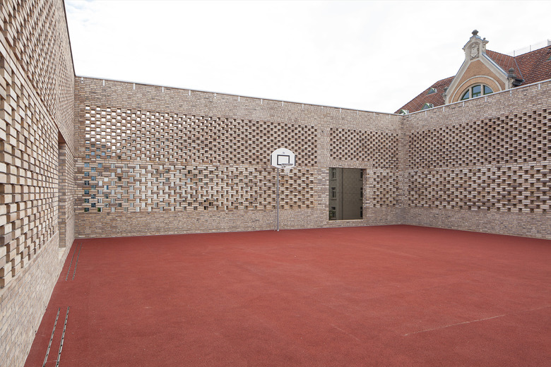 Die Stahlbetonfassade im Erdgeschoss ist fugenlos ausgebildet und trägt die ebenfalls fugenlose Klinkerfassade der Obergeschosse. Die Aussenwände sind zweischalig mit einer inneren Betonwand, einer 20 cm dicken Dämmschicht und der äusseren Klinkerfassade ausgeführt. Die lichtdurchflutete Turnhalle wird von vorgefertigten Betonträgern überspannt.