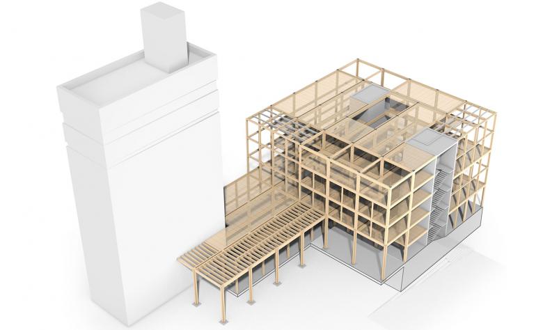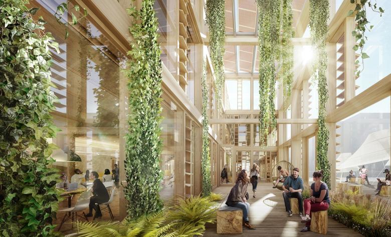 Die Fassade spielt eine Schlüsselrolle im nachhaltigen Klimakonzept. Vorgefertigte, hölzerne Elemente werden in den Raster des konstruktiven Fachwerkes eingefügt. Vertikal und horizontal angeordnete Lamellen dienen der Verschattung und – durch integrierte Photovoltaikelemente - der Energiegewinnung. Die Wintergärten dienen im Frühjahr und Herbst als Quelle solar vorgewärmter Luft und reduzieren so den Energieverbrauch. Heiz-, Kühl- und Lüftungssysteme sind in eine intelligente Holzdeckenkonstruktion integriert, wobei Lehmplatten als thermische Masse dienen.