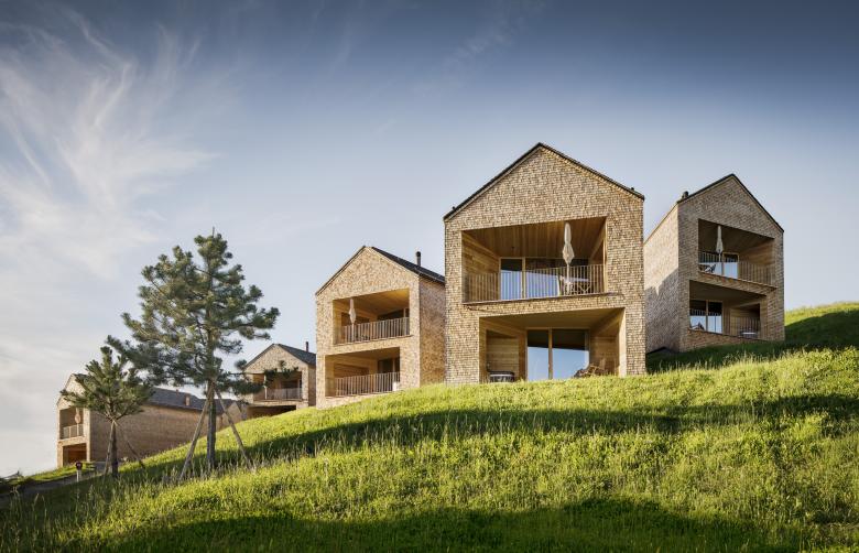 Im Zuge der Planung wurden die Urlaubshäuser in natürlich wirkenden Gruppen und das Haupthaus auf dem Grundstück aufgefächert, damit jedes Gebäude die bestmögliche Aussicht erhält. Platzsparend und daher orthogonal zu den Schichtenlinien positioniert, saugen die zweigeschoßigen Chalets mit ihrer trichterähnlich geformten Stirnseite das Landschaftspanorama an. Von Vorteil ist diese Konfiguration in ihrer Ambivalenz, weil sie nicht nur Ausblick bietet, sondern auch vor Einblicken von der Seite zu schützen vermag. Daher ist es konsequent, wenn nun das Versetzen der geschoßhohen Fenster die Axialität der Stirnseite relativiert. Städtebau findet auch auf dem Land statt, so könnte man die Organisation der kleinen Siedlung beschreiben. In Zeiten der Zersiedelung des Alpenraumes ein umso wichtiger Aspekt dieses Projekts. Die primäre Botschaft der Architektur, nämlich Struktur und Aussicht zu optimieren, wird mit ergänzenden Themen konjugiert: Tatsächlich und sehr bildhaft beschützt das überragende Dach, es nimmt den gesamten ersten Stock bis zum Fenstersturz ein, wobei eine weitere Öffnung nach oben hin, den Fernblick aus der Horizontalen in die Vertikale überträgt. Diese Laterne erfüllt das Obergeschoß mit natürlichem Licht, bewirkt aber noch mehr: Das Licht unterstützt die Plastizität des Daches und streicht über das Relief des verwendeten Materials - Holz. Damit wird wieder eine kleine Irritation eingebracht, ist doch die Verwendung des natürlichen Werkstoffes produktionsbedingt nicht die erste Wahl, wenn es darum geht das Körperhafte der Architektur herauszuarbeiten. Der Dialog von Licht und Material wird auf eine subtile Ebene transformiert, sodass das oft Plakative des Bauens in den Bergen in den Hintergrund rückt. Die grundlegende Komplexität, welche Baumschlager Eberle Architekten mit den kleinen Chalets herausgearbeitet hat, «funktioniert» im größeren Maßstab beim Haupthaus, das als Orientierungspunkt in der Landschaft wirkt.