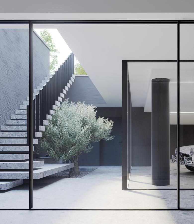 Das Untergeschoss sowie die Tiefgarage münden vollverglast in einem gemeinsamen Lichthof, der auch die Sichtbeziehung zu den Aufenthaltsräumen im Untergeschoss, einschließlich eines Weinkellers für Weinverköstigungen, ermöglicht.