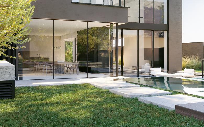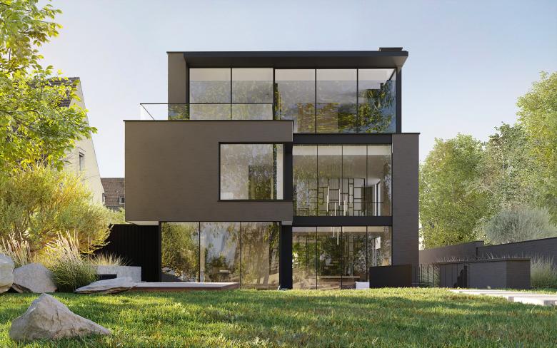 Die Entlüftung der Tiefgarage ist geschickt in die Gestaltung des Gartens integriert, wobei Gartenmöbel und eine Außenküche funktionale Elemente darstellen. Ein Spiegelbecken im Garten verleiht dem Außenbereich eine elegante Note.