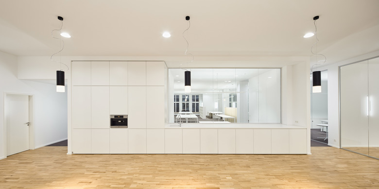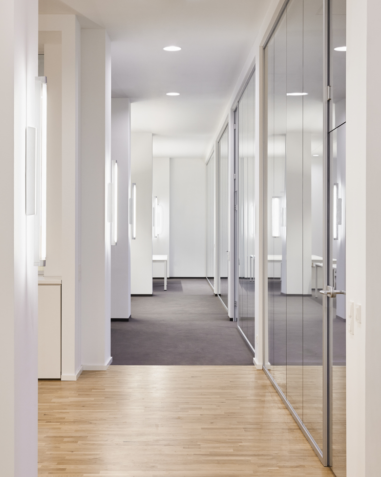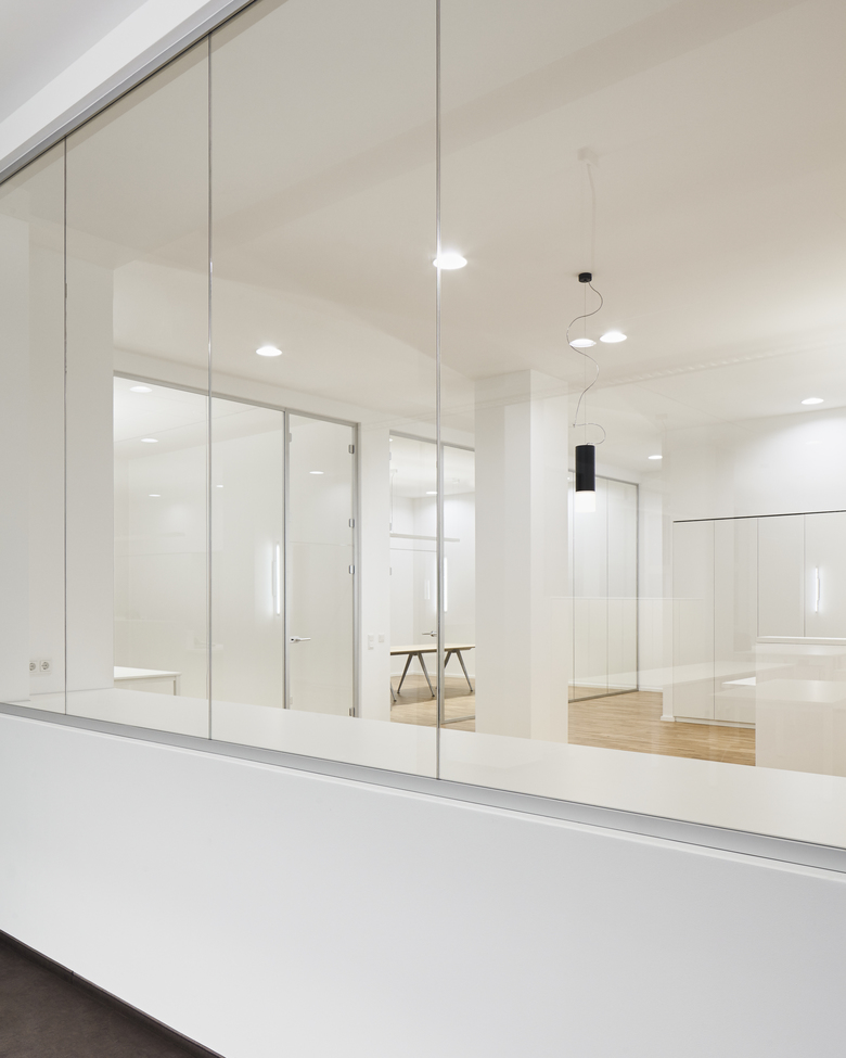 Im Zentrum Dresdens mit Blick auf die Frauenkirche und den Altmarkt ist aus einer vernachlässigten Fläche in der Altmarktgalerie eine offene und lichtdurchflutete Bürofläche entstanden. Das Büro ist in einen repräsentativen und einen privaten Bereich geteilt. Beide Bereiche sind durch einen Multifunktionskörper von einander separiert. Durch den Körper werden Sichtbeziehungen möglich, sodass ein offenes Raumgefühl entsteht. In den Körper ist in Kooperation mit einem Schreiner eine offene Einbauküche entstanden die die sowohl von den Mitarbeitern, als auch von externen Besuchern genutzt wird. Alle Fronten wurden in weißem Lack und flächenbündig realisiert. Die großen Fensterfronten im Objekt deuten auf die verschiedenen Landmarken in direktem Umfeld. Technische Herausforderung war es Brandschutz, Denkmalschutz und das Gestaltungskonzept zu vereinen und technische Notwendigkeiten zu verstecken. Elektrotechnisch wurde die Fläche auf den aktuellen Stand der Technik gebracht. Die moderne Haustechnik wirkt nicht aufdringlich, sodass der Charme des Altbaus mit den zeitgenössischen Elementen für sich steht.