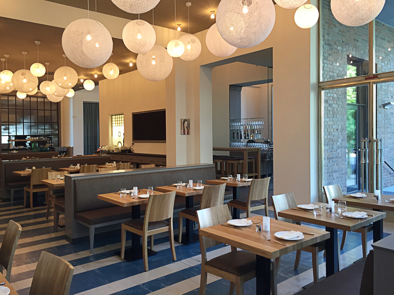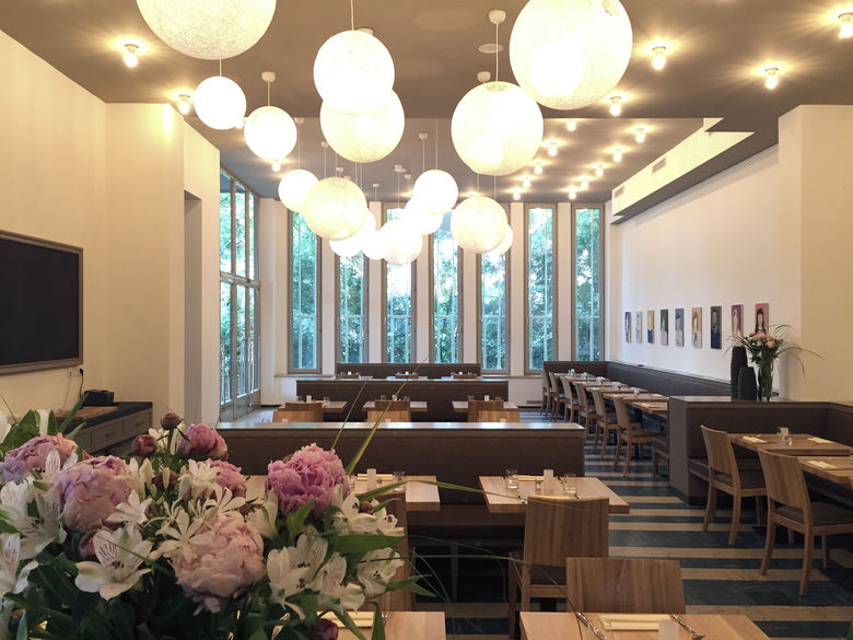 Versetzen der Küche I Beleben der Schaufassade (Nord-Ost) | Die ehemalige Küche wurde in den hinteren Restaurantbereich (Querriegel hinter Empfang, rechte Seite) verlegt. Durch die zentrale Lage im Gebäude können die Küchenabläufe hierdurch optimiert werden. Des Weiteren wird durch die Umnutzung der ehemaligen Küche zu einem Gastraum ein qualitativ hochwertiger Raum mit direktem Tageslicht und leicht separierter Lage geschaffen. Hierdurch wird das Gebäude auch von aussen für vorbeilaufende Passanten belebt, da diese von Aussen einen Blick in das Gebäudeinnere werfen können.