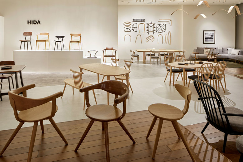 A store where you can experience Hida Takayama furniture. Hida Sangyo, the company that operates the shop, is a woodworking furniture manufacturer that continues to develop cedar, which was once considered unsuitable for furniture, into furniture. To make their skills felt everywhere, the facade is made of 50% compressed cedar wood, and craftsmen’s tools are displayed on the wall to visualize their skills and to increase the affinity between the users and the manufacturer.