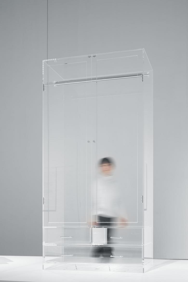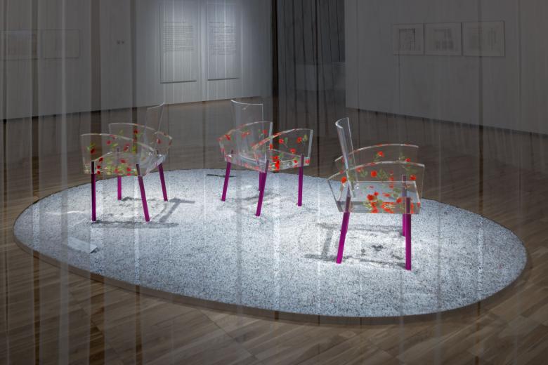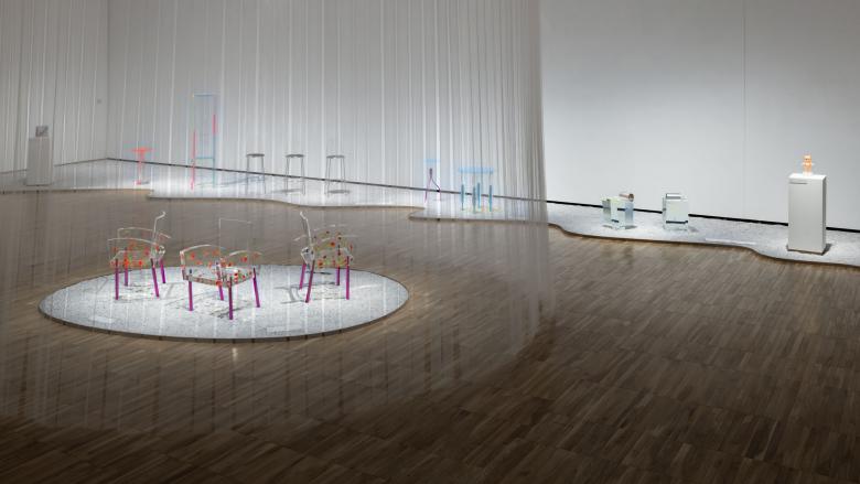 The exhibition structure is divided into four rooms and unfolds chronologically from chapters 1 to 4. In the first half of the exhibition, chapters 1 and 2, three-dimensional works are arranged on a stage in different layouts: one row for chapter 1 and two rows for chapter 2. The timelessness of the works is highlighted by the materials used in the works, which incorporate transparency, monotone, and light.