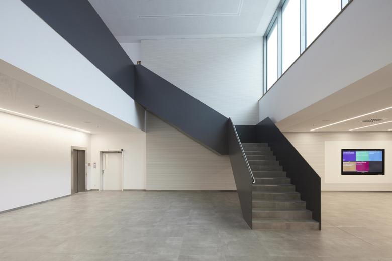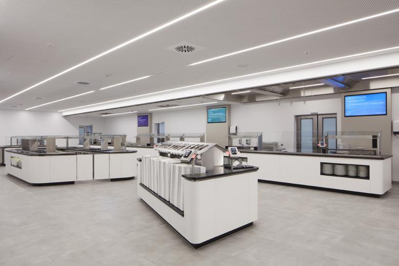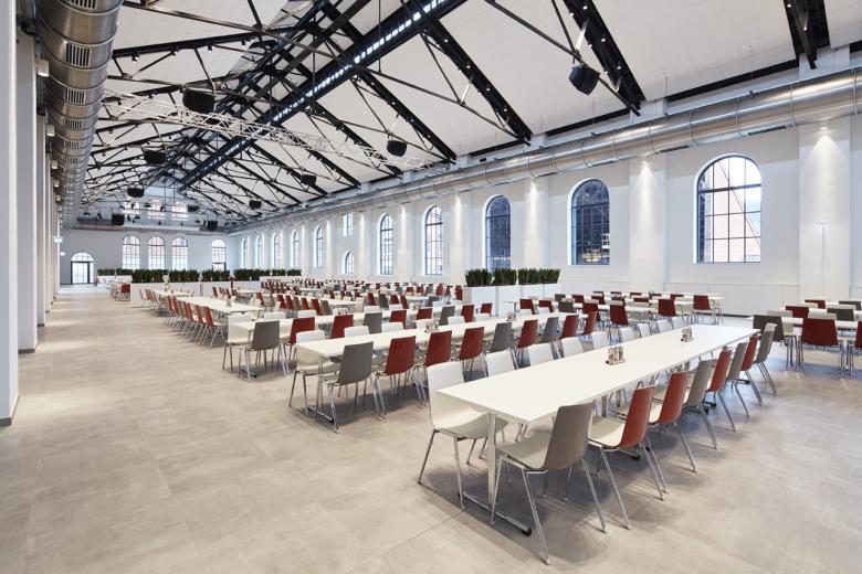 Mit viel Feingefühl haben wir die historische Substanz erneuert und durch einen Anbau ergänzt. Entstanden ist ein großer Speisesaal, der sich kathedralenartig öffnet und Platz für 800 Personen bietet. Ein funktionaler Küchentrakt mit Free-Flow-Bereich sowie Event- und Casinoräumen für kleine Gästegruppen ergänzen das Gebäudekonzept. Das Besondere am Speisesaal: Er kann zur Eventhalle für Veranstaltungen mit 1000 Mitarbeitern umgebaut werden.