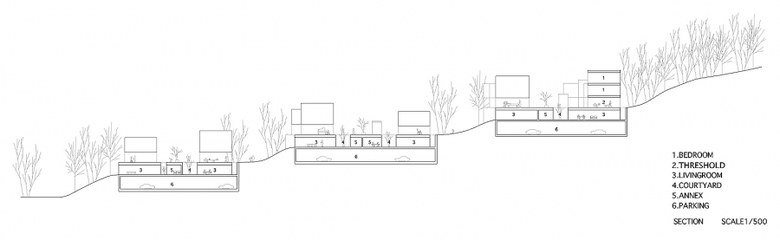 There are totally 9 clusters in the site. Each cluster consists of around 9-13 residential units, with 3-4 stories. The communal deck on the second level connects the transparent space in each housing unit called "Shiki".