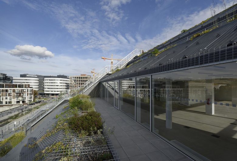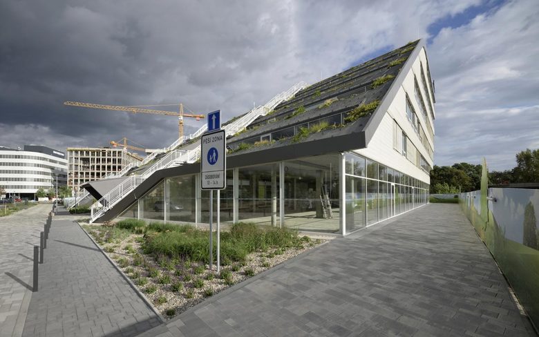 The V-shaped office building protected by a sloped green roof with terraces towards the riverfront is part of the emerging Prague DOCK office park designed by Schindler Seko architects.