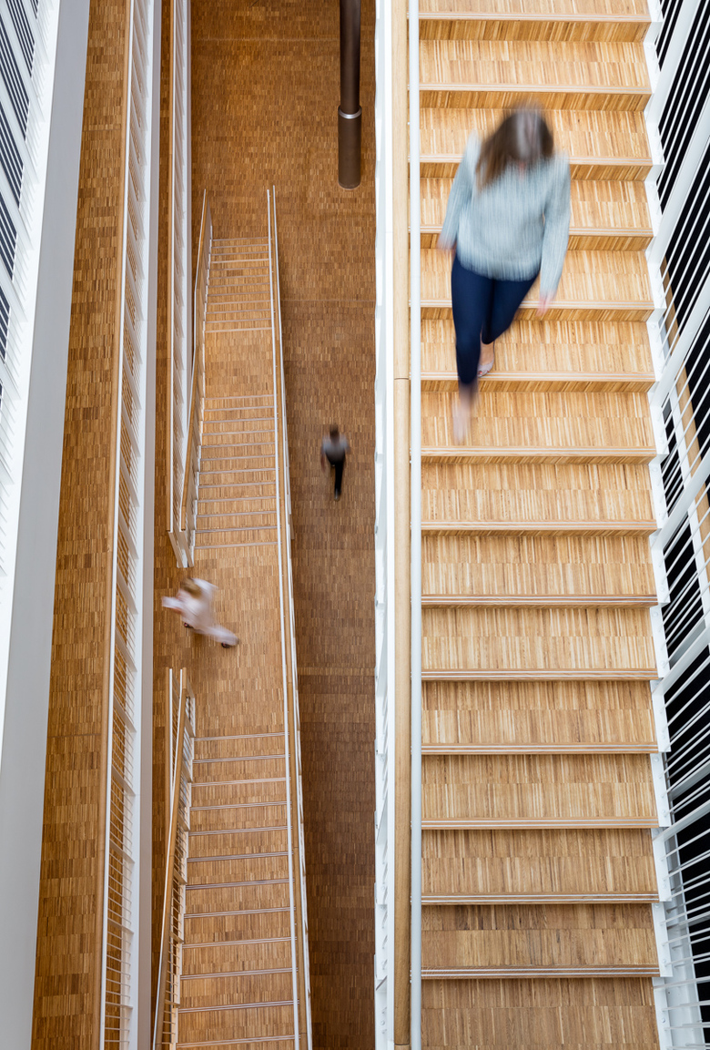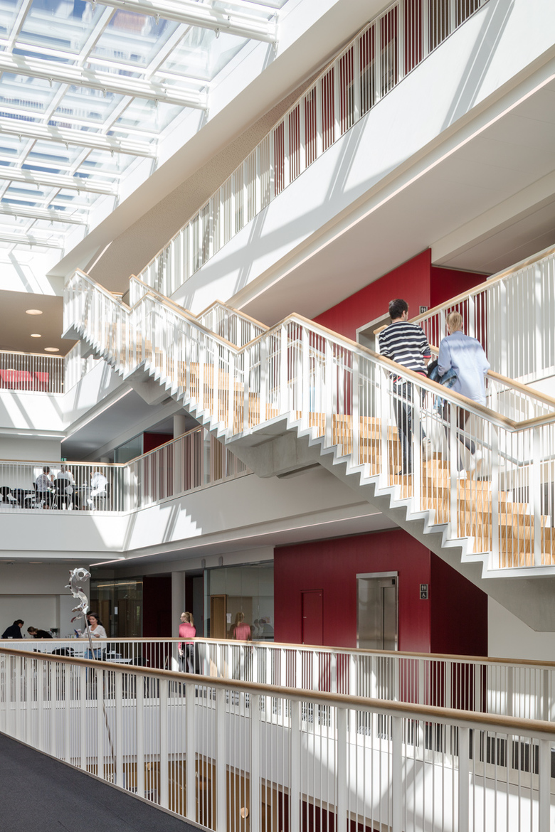 The building appears as two stacked, juxtaposed ‘Vs’. This form establishes a clear visual separation between the two programmatic functions: patient hotel and hospital administration. The facade appears as a horizontal relief clad with light natural stone, which adds a strong character to the building while also allowing it to shade itself. Two sky lit atria bring natural light deep into the building and function as arrival areas and gathering places for the Patient Hotel. Open staircases in both atria connect the individual floors.