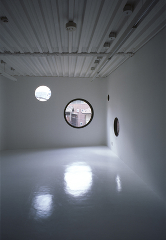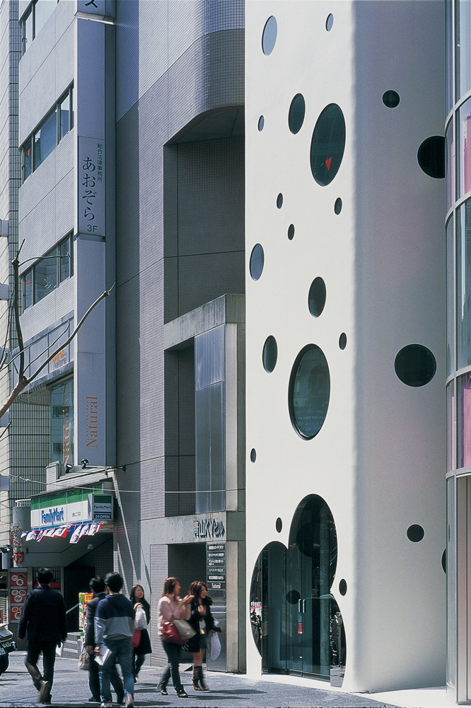 狭い敷地でも建物内部の有効面積を最大限に獲得できる外殻構造。1,2階は店舗、3,4階はSOHO、5階は施主の住居。外壁を兼ねた構造体は、わずか4.5mm厚の鋼板を使ったセミモノコック。造船技術で造られた。