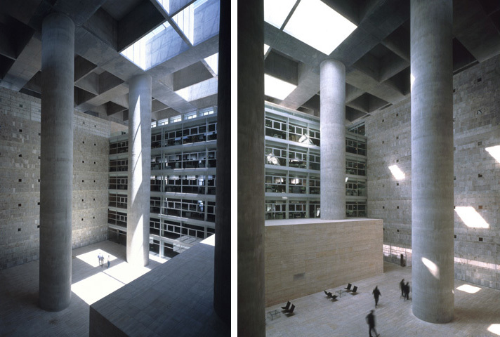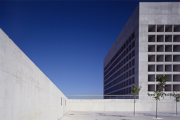 The parking areas, archives and Data Processing Center are accommodated in this podium. Offices are arranged inside the cube on seven floors around the central interior courtyard. The cube was constructed on a 3 x 3 x 3m grid of reinforced concrete that in the roof serves as a light-gathering mechanism, the central theme of this building. The two facades to the south operate as a “brise-soleil” and, filtering this powerful light, illuminate the areas of open offices. The two facades to the north, serving the individual offices, receive the homogeneous and continuous light of this orientation and are closed to the exterior by means of a stone and glass cladding.