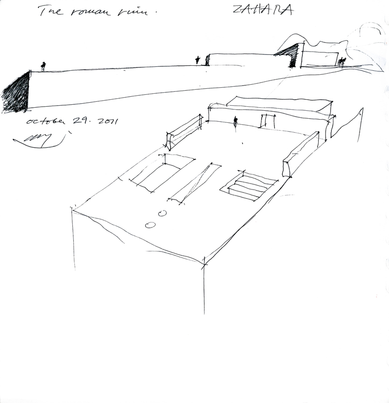 There we have erected a house as if it were a jetty facing out to sea. A house that is a podium crowned by an upper horizontal plane. On this resoundingly horizontal plane, bare and denuded, we face out to the distant horizon traced by the sea where the sun goes down. A horizontal plane on high built in stone, Roman travertine, as if it were sand, an infinite plane facing the infinite sea. Nothing more and nothing less.
