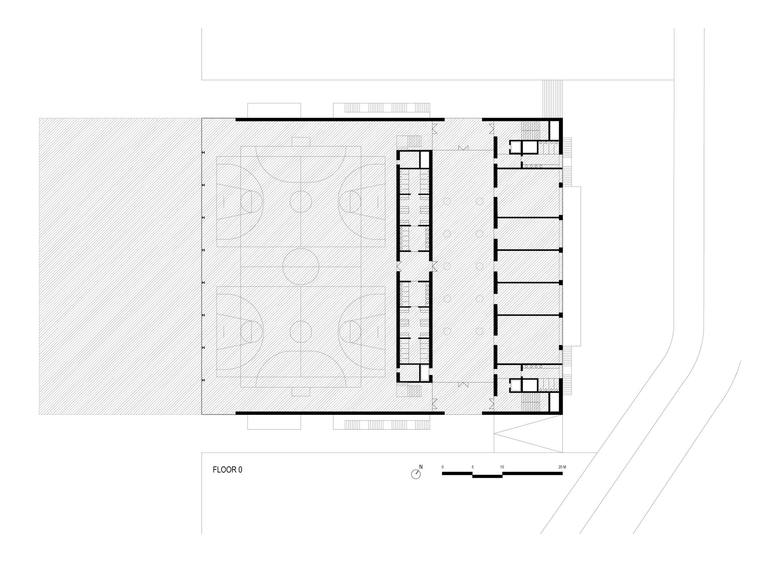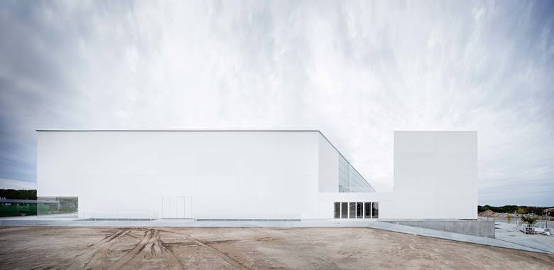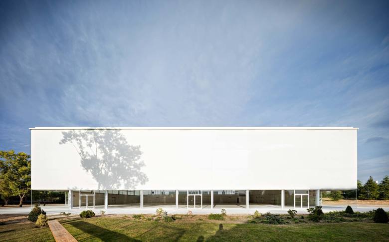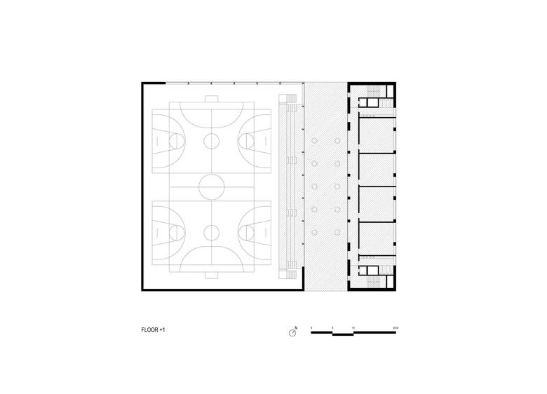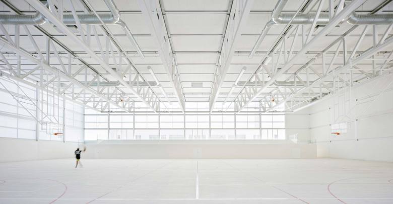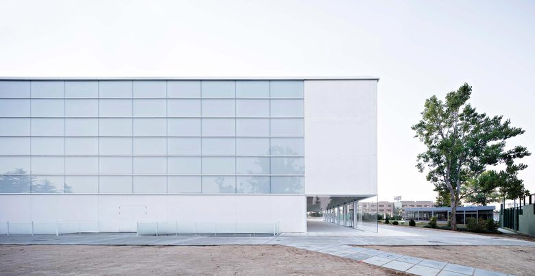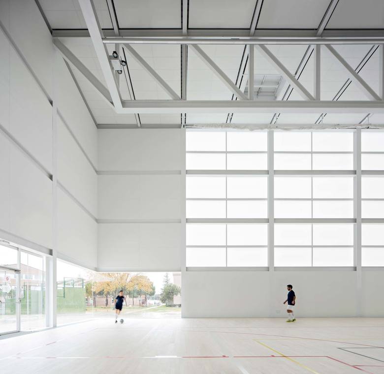The sports pavilion is designed with lightness in mind, in glass fiber reinforced concrete GRC, unlike the more closed and heavier classroom complex and low interconnecting building, with their white concrete finish. The volume of the sports complex is a decisive differentiating factor in terms of orientation, so that the facades of the southern dihedral, more exposed to sunlight, are enclosed in a prefabricated panel of glass fiber reinforced concrete GRC, while those of the northern dihedral are in translucent glass. The southwestern facade features a low strip of transparent glass highlighting the link with the main square of the campus. And this mechanism of transparency is repeated on the north eastern facade facing the upper patio. Thus a visual relationship is created between the square and the sports complex, while the southwestern façade of the classroom complex becomes a backdrop to the complex as a whole.