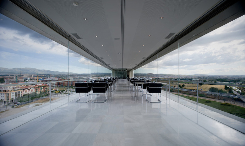 And to finish the whole a strong vertical piece emerges, as if it were a Gate to the City, the same height and width as the main building of the CAJA GRANADA. From the highway that encircles Granada it appears as a screen-like façade covered with messages writ large plasma screens that entirely cover it. Like Piccadilly Circus in London or Times Square in New York.