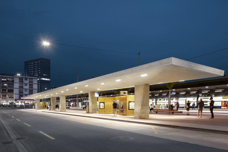 Skulptural gestaltetes Busdach in Beton auf dem Max-Frisch-Platz in Zürich Oerlikon. Messingverkleidete Paravents als Windschutz und gestalterische Klammer der heterogenen Haltestelleninfrastruktur.