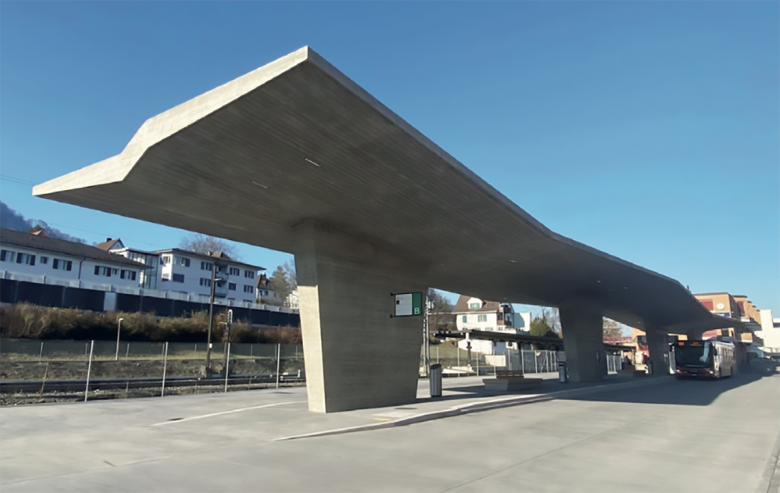 Die grosszügige und repräsentative Gestaltung des Bushofplatzes ermöglicht eine angenehme Koexistenz der vielfältigen Nutzungsansprüche von Bewegung und Aufenthalt durch Fussgänger, Velos und Busse. Ein einheitlicher Belag, Baumgruppen und das eigenständige Dach der Bushaltestelle prägen den neuen Platzraum. Mit seiner gefalteten Dachform strukturiert und positioniert es den Ort. Die Bretterschalung der Betonoberfläche folgt der Geometrie und unterstützt die Faltung – die ‹Wellen›.