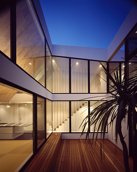 都心の閑静な住宅地にある旗竿敷地。アプローチから感じる閉鎖的なイメージとは対照的に、大きな中庭を中心とした開放的な内部空間は、外界を遮断しながら独特の小宇宙をつくりあげている。夫婦でハンモックに揺られ、バーベキューをしながらワインを楽しむためダイニングやオリジナルキッチンも充実。開放的なコートとは対照的に、一人になれる瞑想空間や書斎も完備。まさに都市生活者のための極上リゾートのような隠れ家である。
