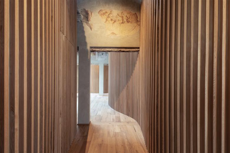 The two volumes were originally intended for a small theater room and a residential building respectively. Our project, keeps the distribution scheme of the plant unchanged and works on the redefinition of the individual internal and external spaces, through the introduction of architectural elements, furnishings and the search for finishes capable of expressing an idea of spirituality