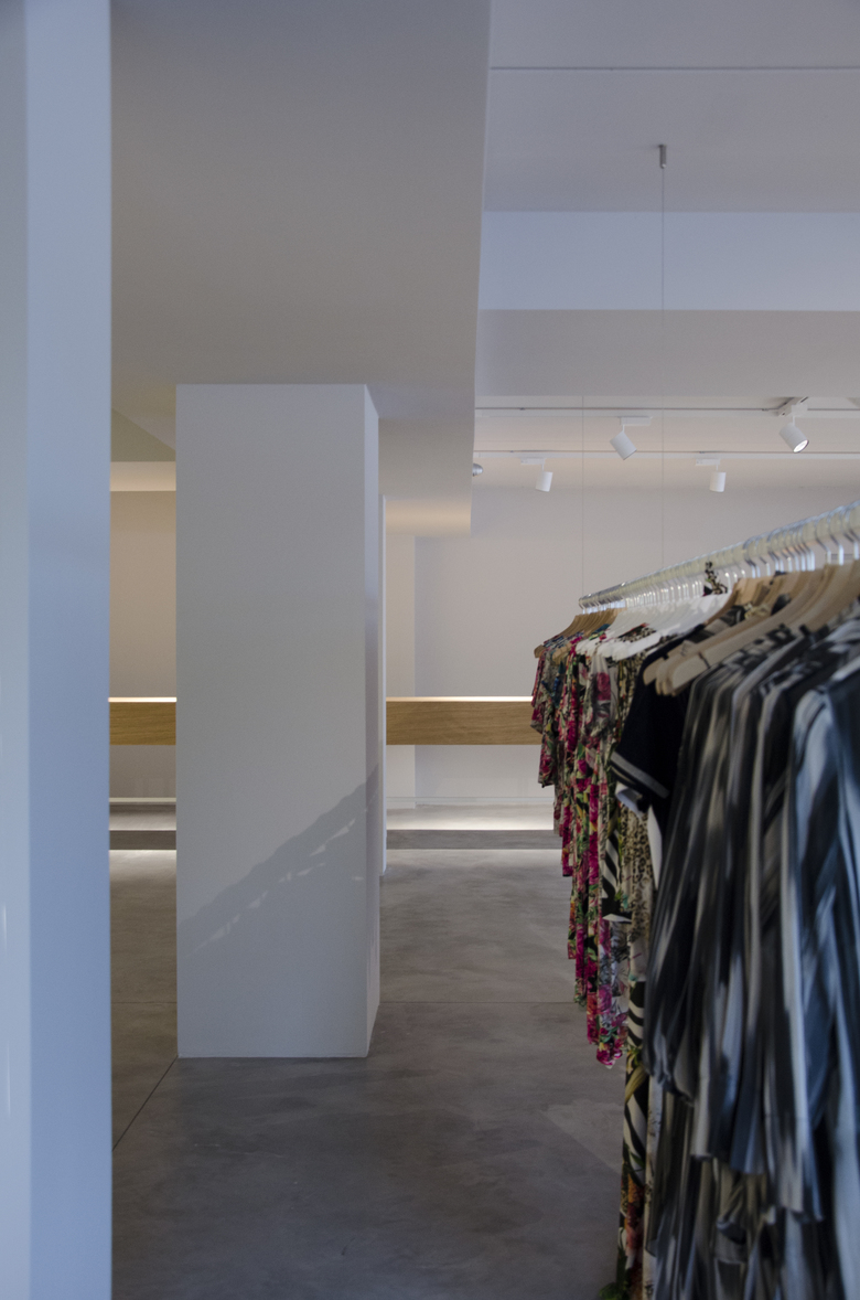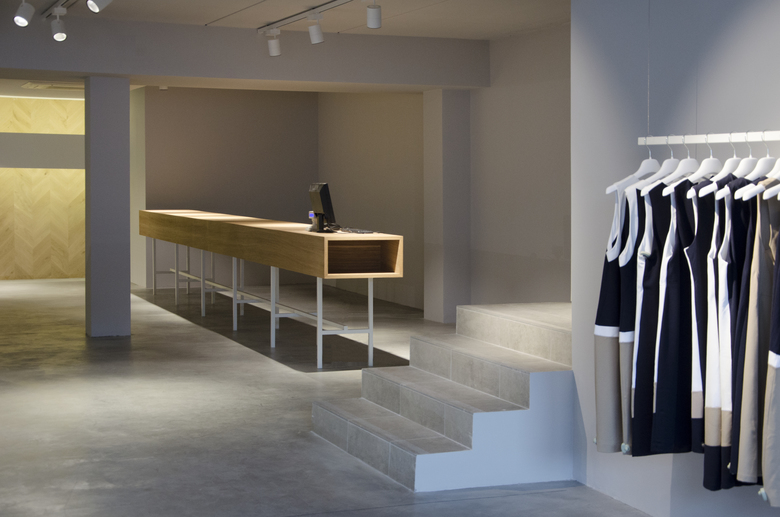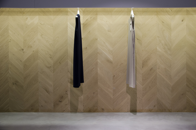 The concept store is characterized by the presence of a long display wall covered with oak herringbone that is shaped like the bottom of the exhibition space, a large skeletal desk made in oak sawn and a ceiling system consisting of bars that mark the extent of the space.