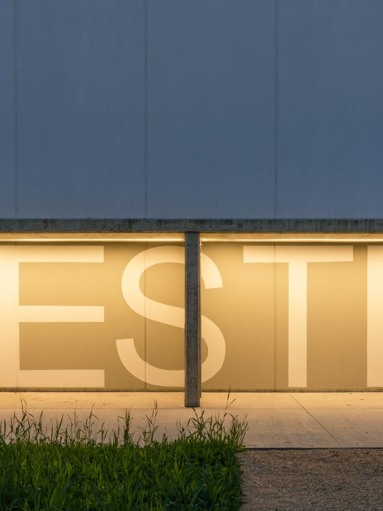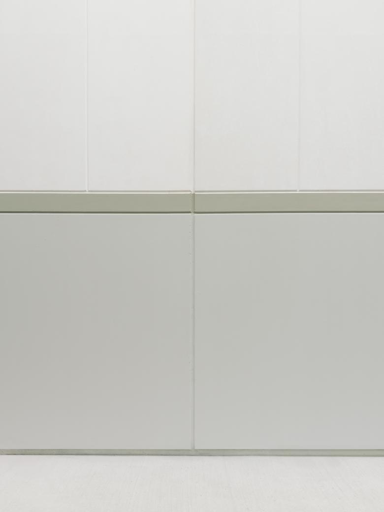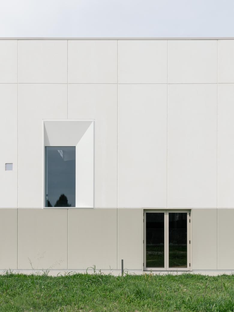 On the shorter side, a gradual abstraction of the façade elements occurs, culminating in the elevation facing the green system, where small irregular openings dematerialize the façade—except for one large selective opening oriented towards two symbolic landmarks of the community: the bell tower and the chimney.