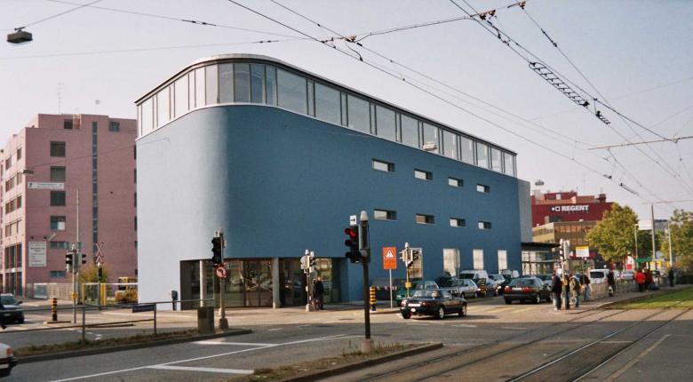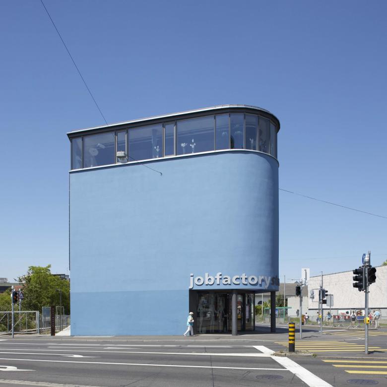 Ziel war es, die Prägnanz und Geschlossenheit des Baukörpers zu erhalten und gleichzeitig gezielte Einblicke in das Gebäude zu ermöglichen. Dies wurde durch zwei wesentliche Eingriffe erreicht: Der Haupteingang wurde in einer als Fuge ausgebildeten Rundung angeordnet und führte direkt zur inneren Erschliessung mit der linearen Haupttreppe. Fassadenbündig eingebaute Schaufenster dienten als transparente Hülle und erlaubten kontrollierte Einblicke in das Innenleben und das Verkaufsgut. Die bewusst versetzte Anordnung von Eingang, Schaufenstern und Werbeträgern verlieh dem Gebäude Dynamik und verwies auf die Aktivitäten junger Nutzer. Grossflächige, integrierte Werbeträger kommunizierten die Verkaufsaktivitäten nach aussen und konnten flexibel gewechselt werden. Eine laternenartige Aufstockung markierte die kulinarischen Angebote und setzte insbesondere bei Nacht einen architektonischen Akzent. Die einheitliche Blaufärbung der Fassade verlieh dem Gebäude eine eigene Identität; Beleuchtung und Transparenz machten die inneren Aktivitäten sichtbar und kennzeichneten Nutzungs- und Ruhephasen.