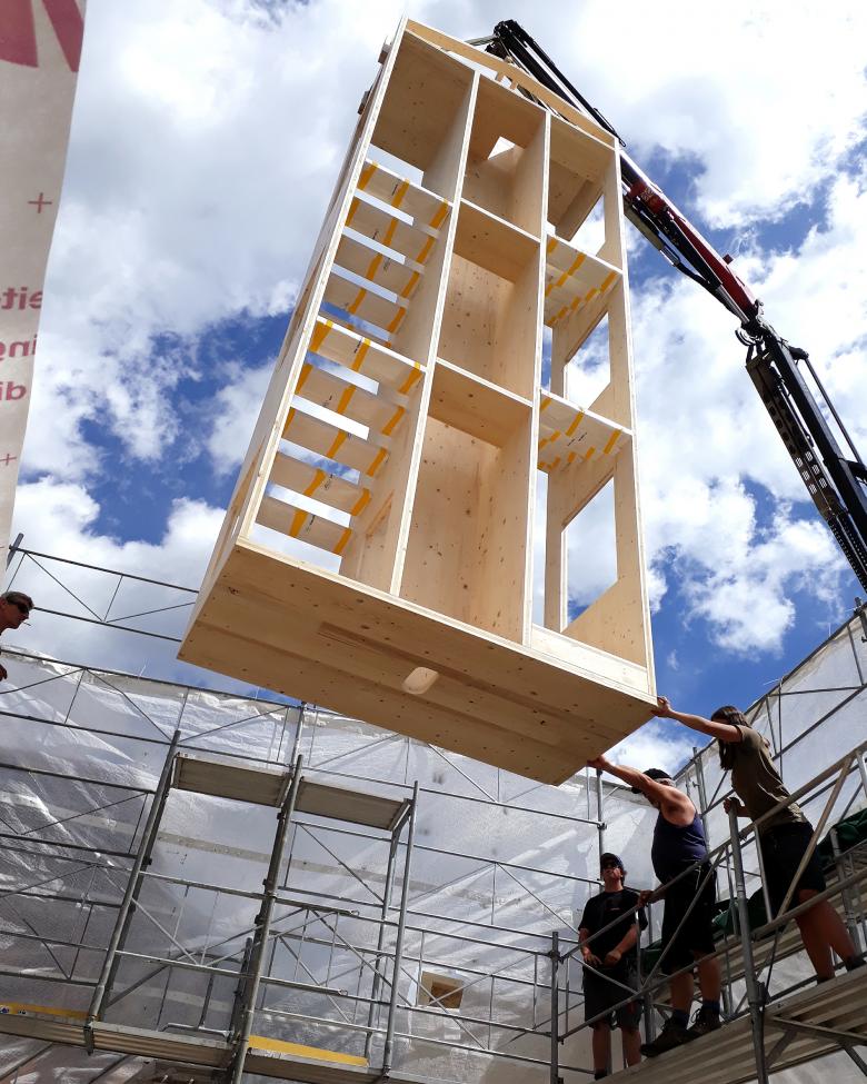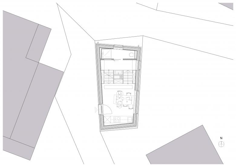 Die grosse Herausforderung lag darin, den begrenzten Raum möglichst effizient zu nutzen. Kern des neuen Einfamilienhauses ist ein Brettsperrholzturm, der die Halbgeschosse miteinander verbindet und gleichzeitig verschiedene Funktionen übernimmt. Der hölzerne Elementturm dient als Raumtrenner, Treppenturm, Steigzone, Kamin, Pelletslager und beherbergt über alle Geschosse hinweg Einbauschränke und Regale. Gleichzeitig übernimmt der Turm die statische Funktion einer Stütze und leitet die Lasten der Firstpfette in den Boden. Diese Nutzungskonzentration erlaubt es den Bewohnern den restlichen Raum frei zu Nutzen.