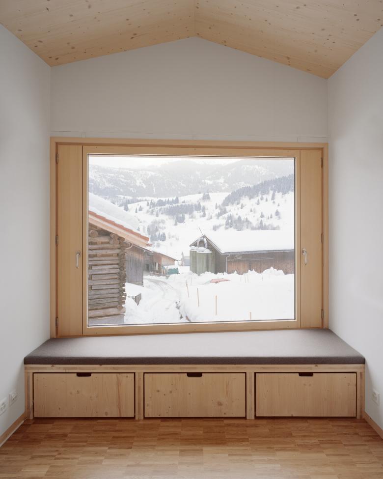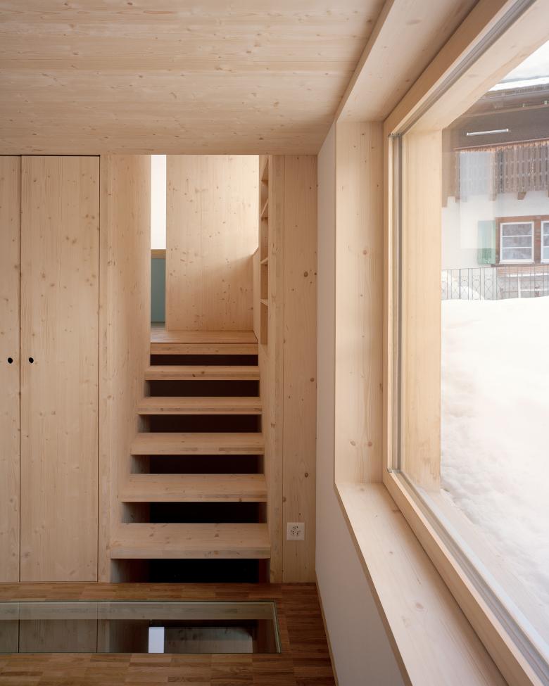 Grosse Glasflächen bringen viel Licht ins Haus und erlauben aussergewöhnliche alpine Ausblicke. Gleichzeitig verwehren sie durch ihre Positionierung dem Aussenstehenden trotz der dichten Gebäudeanordnung im Dorfkern intime Einblicke. Das Hofstattrecht verhindert eine Erhöhung des Gebäudes und so mussten auch die unterirdischen Räume nutzbar und attraktiv gestaltet werden. Ein gläserner Bodenausschnitt im Erdgeschoss ermöglicht, dass das Tageslicht bis ins Untergeschoss reicht. Trotz einer gesamten Wohnfläche von lediglich 55 m2 wirken die Räume grosszügig. Das Auge des Betrachters kann durch die offene Treppe die gesamte Gebäudelänge wahrnehmen, wodurch die Räume grösser wirken.