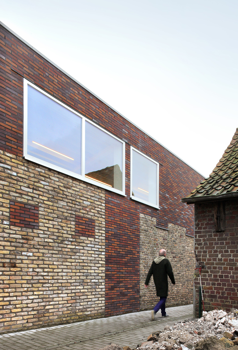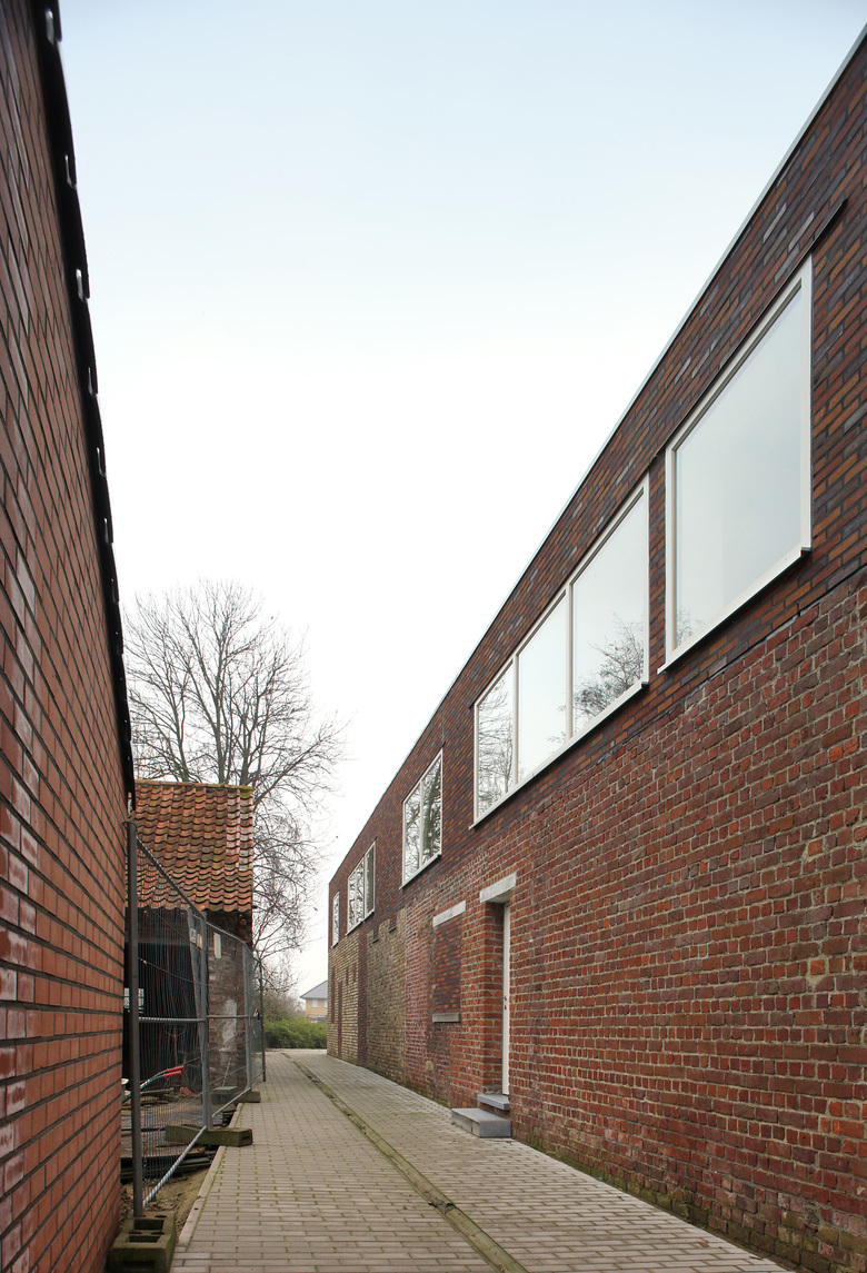 In Westvleteren the existing complex of buildings consisted of multiple successive structures, ranging from a 19th century school building and an old town hall, to an industrial structure from the 1990s. The dilapidated storage building made way for an enlargement of the meeting hall. And so the back yard became an outdoor space for the party room. The gabled roof was replaced by a single sloped roof, thus making the room and space higher, and creating better acoustics in the main hall. A central entrance hall connected the different functions and spaces and accentuated the entrance of the building. By using different types of bricks we emphasised the successive renovations in the past. The new added walls built from contemporary bricks, strengthened the patchwork of these different bricks. Thus, the community centre was adapted to the modern requirements, while respecting the environment and the users, and adding a whimsical character.