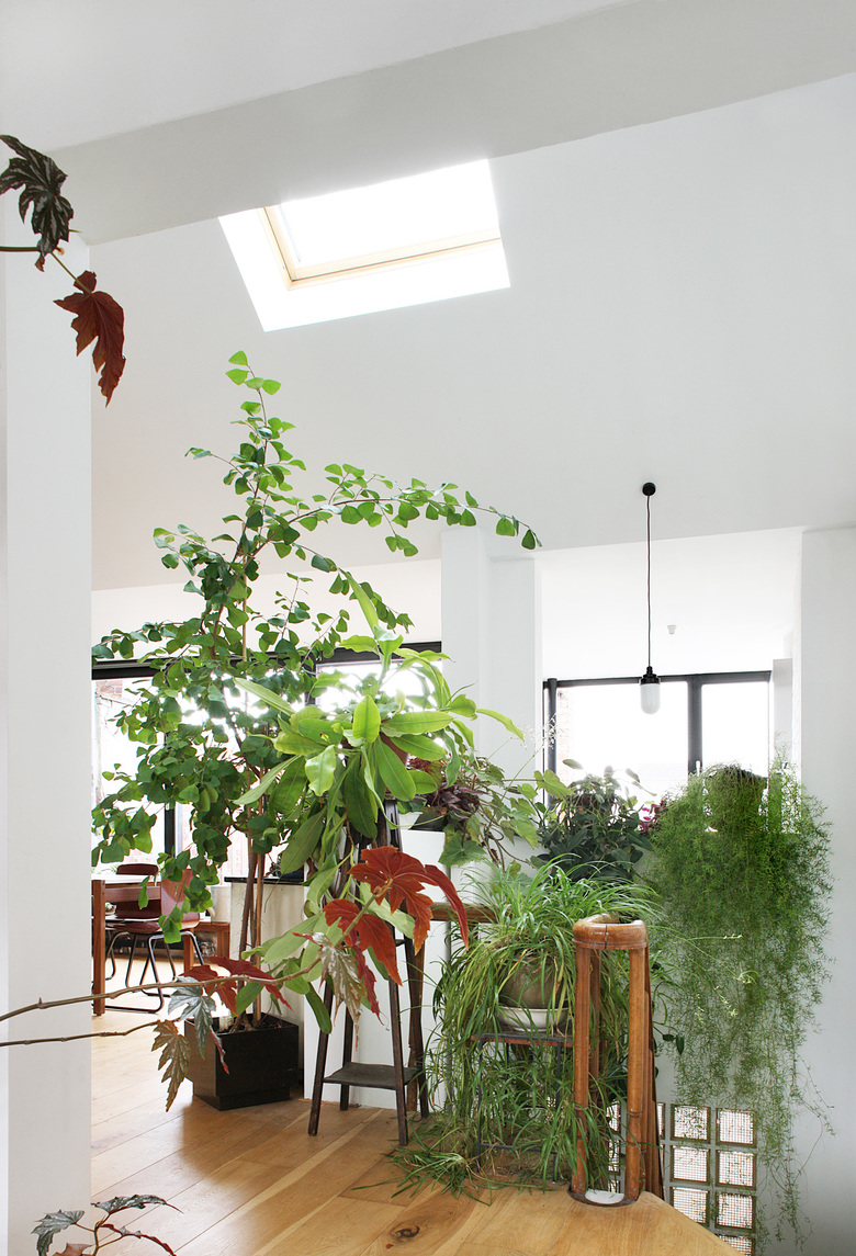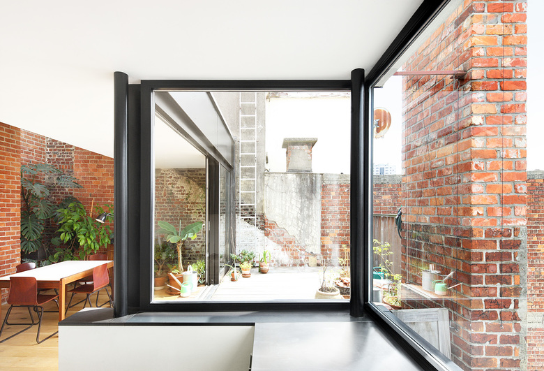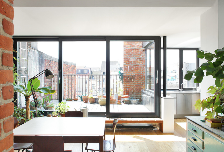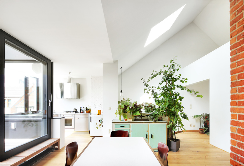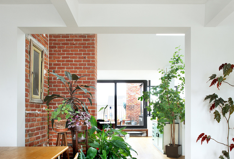 This duplex apartment is on the third and fourth floor of an apartment building in the centre of Brussels. Several separate small rooms on the fourth floor were converted into a large living space. The dilapidated ceiling at the back was taken out, making the apartment very spacious. Large windows along the rear façade fold around the patio and bring the urban landscape into the heart of the home. The many ducts and chimneys of the underlying apartments are not concealed. On the contrary, they are a crucial part of the interior, together with the exotic plant collection of the resident. The existing brick wall is kept visible. The use of different types of brick displays the many historical layers of the building. Roof lights emphasize the verticality of the ducts and chimneys and the spaciousness of the apartment. This creates an interplay of light and shadows throughout the day.