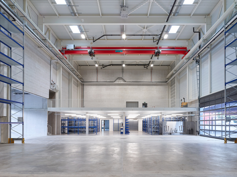 Im Neubau verschmelzen nun die Büroräume und die Lagerhalle optisch zu einem Kubus. Die Büros schließen in einer L-Form an die Halle an. Um Arbeitswege und -schritte zu erleichtern, integrierten wir die ehemaligen extern dazu gemieteten Lagerflächen in das Gebäude und erreichten eine weitere Nutzungsfläche durch eine Unterkellerung des Gebäudes.