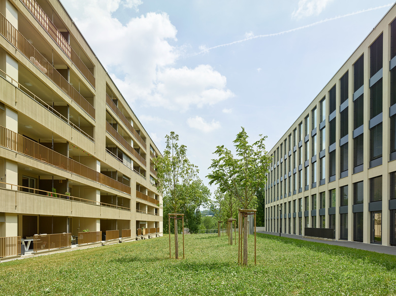 Das Wohngebäude mit 65 2,5- bzw. 3,5-Zimmer-Wohnungen zeigt eine aufwändig mit Modellierputz gekämmte Fassade. Die Wohn/Ess-Bereiche sowie der Balkon sind nach Süden ausgerichtet und orientieren sich zum neuen Quartierpark, der als Treffpunkt und Erholungsgebiet dient.