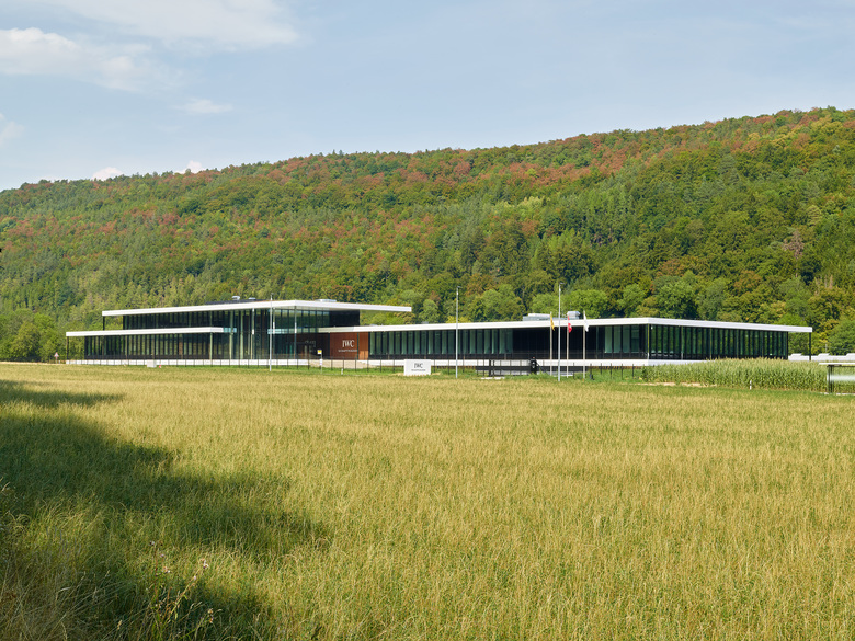 Das IWC Manufakturzentrum fügt sich elegant und schlank in die hügelige Landschaft bei Schaffhausen am Rhein, als Solitär mit großer Ausstrahlung. In seiner Form erinnert es an pavillonartige Gebäude der Moderne und berücksichtig insbesondere das Hochwertigkeit ausstrahlende Corporate Design der Luxusuhrenmarke IWC. So wie IWC Handwerkskunst und technische Innovationen vereint, um Uhren der Sonderklasse zu fertigen, so lässt sich auch das neue Manufakturzentrum als Kombination von baulicher Handwerkskunst und technischer Innovation lesen.