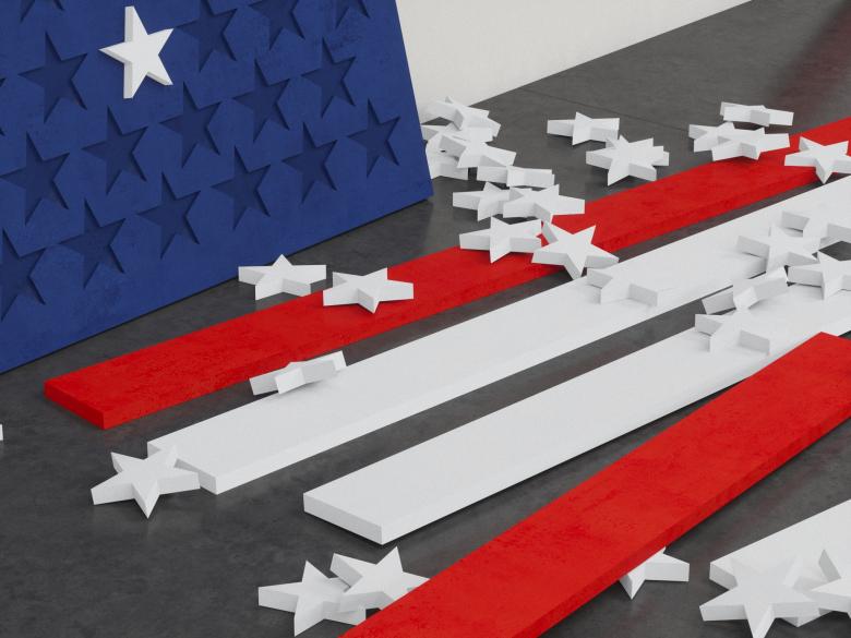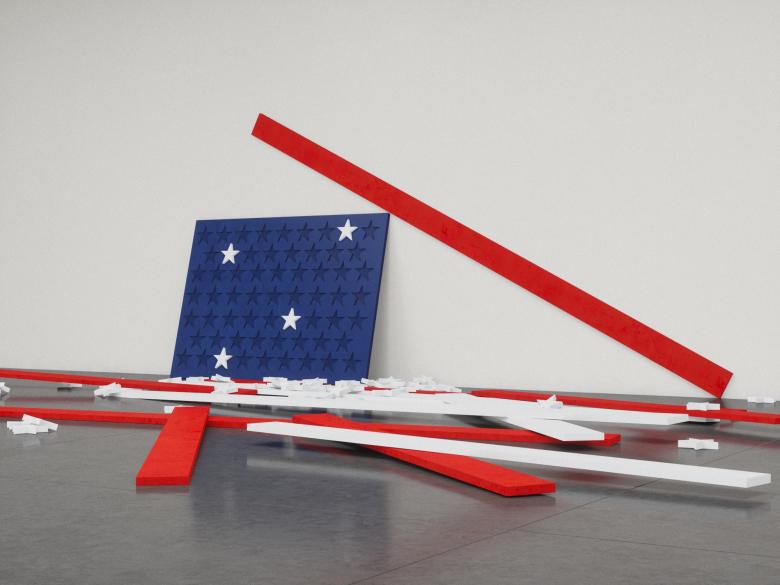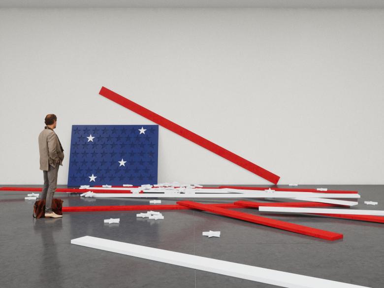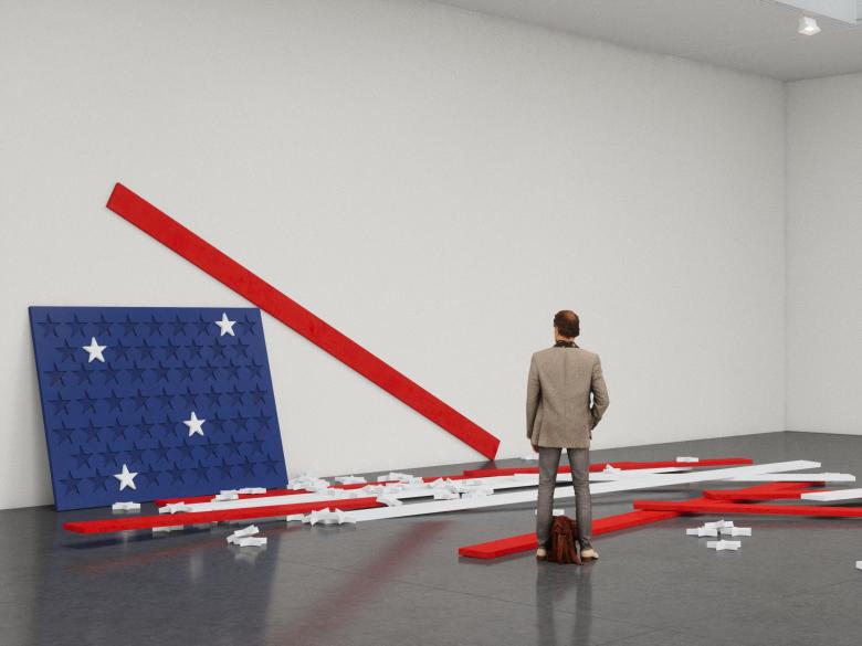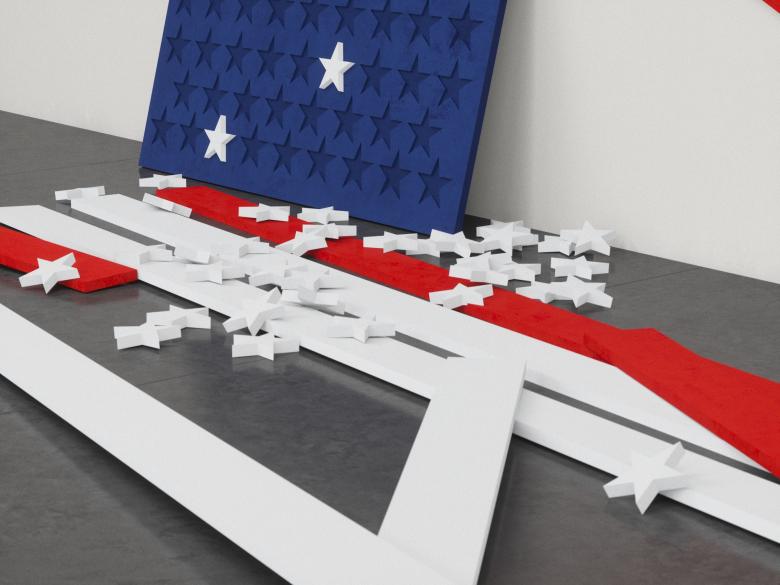 A false flag operation is an act committed with the intent of disguising the actual source of responsibility and pinning blame on a second party. John Beckmann’s “False Flag” depicts this fractured American landscape with an exploded flag as its new symbol. Welcome to the decimated empire of the Dis-United States. [ Finis ]