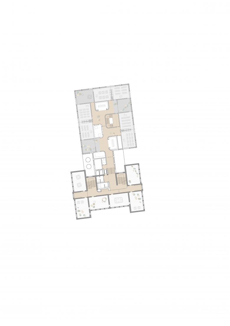 Ausgangspunkt für den Anschluss des Neubaus an den Bestand ist der im Grundriss auffällige Kernbereich zwischen den zwei Treppenhäusern. Der vom Bestand ausgehende Mittelflur wird durch eingestellte und versetzte Funktionskuben aorta-ähnlich verzweigt, um die als Cluster angeordneten Klassen- und Differenzierungsräume in den beiden Obergeschossen zu versorgen. Die Kuben nehmen die Garderobenbereiche, das notwendige Treppenhaus und ein Lichthof auf. Abrundungen, die als Reminiszenz an die Eingangsnischen bei den Klassenräumen im Altbau verstanden werden können, bewirken fließende Raumfolgen und schaffen flexible und transparente Übergänge zwischen den einzelnen Nutzungen. Der Flur dient nicht bloß der Erschließung, sondern kann zusätzlich für Lern-, Kommunikations- und Spielzwecke angeeignet werden. Die verglasten Wände der Differenzierungsräume können sowohl großzügig geöffnet als auch geschlossen werden. Mit der Vernetzung aller Räume und Funktionen entsteht eine vielfältige Raumlandschaft, die stetig wechselnde individuelle und kooperative Lernangebote ermöglicht.
